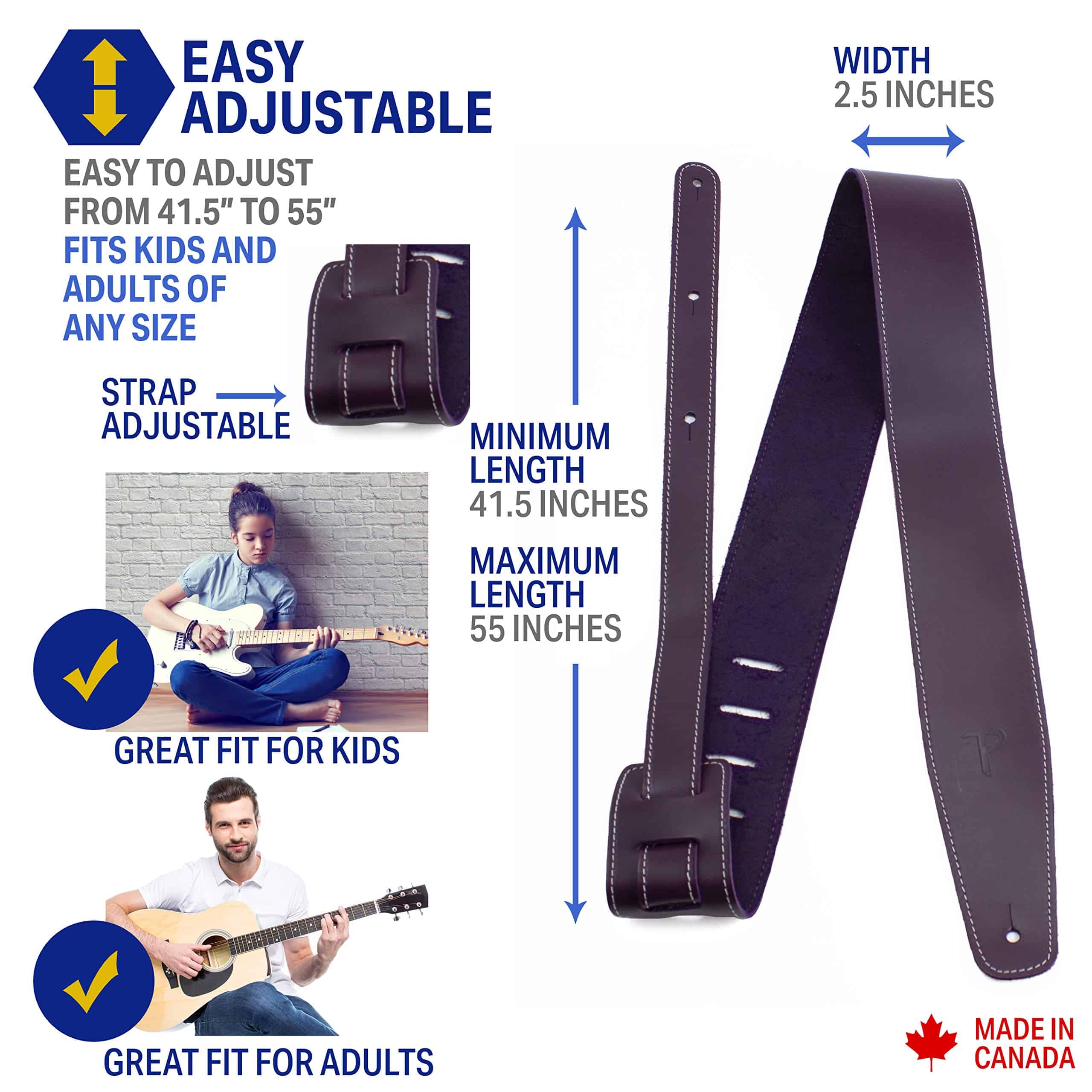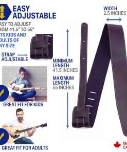 Esta correa de guitarra está diseñada en cuero curtido en Sudamérica; efecto de pull up; apariencia vibrante y desgastada; combinación de ceras y aceites transparentes que le dan un tacto muy suave y lujoso. Este accesorio de guitarra tiene un ancho de 2.5 pulgadas, longitud ajustable de 52 a 58 pulgadas para un ajuste óptimo; antideslizante, duradero, cómodo, fácil de colocar. Compatible con una variedad de guitarras incluyendo acústicas, de bajo, eléctricas; Diseñada para funcionar con todos los sistemas de bloqueo de correas; Una idea de regalo genuina para cualquier entusiasta de la guitarra o la música. Perri’s Leathers Ltd., fabricante canadiense de correas de guitarra innovadoras de alta calidad y accesorios para instrumentos musicales; con orgullo de propiedad familiar y operado desde 1998. Perri’s Leathers Ltd. ofrece un reemplazo por defectos en material, mano de obra o calidad bajo uso normal durante 180 días a partir de la fecha de compra con un reemplazo.