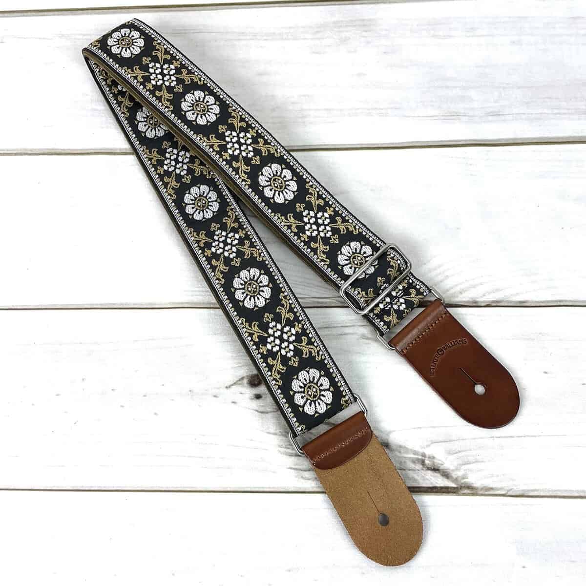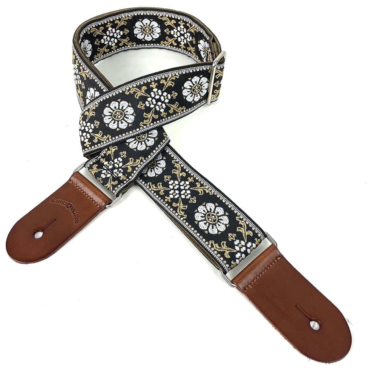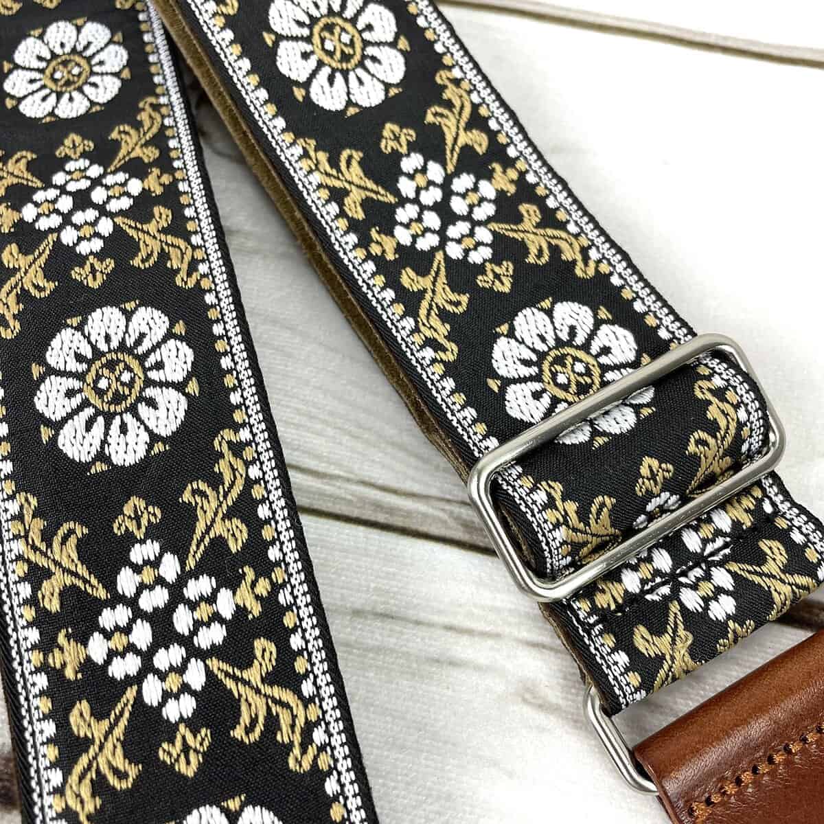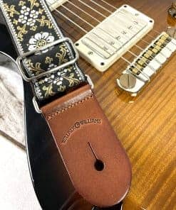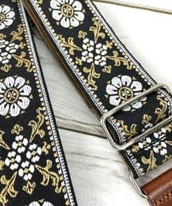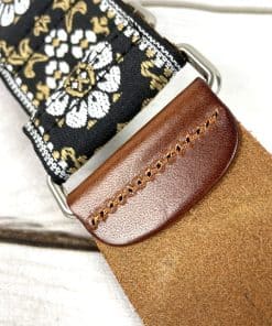 1. Diseño nuevo de mandala dorado y blanco sobre fondo negro. 2. Material de respaldo de peluche suave de alta calidad. 3. Tapas de extremo de cuero marrón de grano grueso. 4. Herrajes de níquel cepillado. 5. Extremos de doble costura. 6. Fondos de tapas de extremo suaves y redondeados. 7. Ancho de 2″. 8. Ajustable de 32″ a 55″