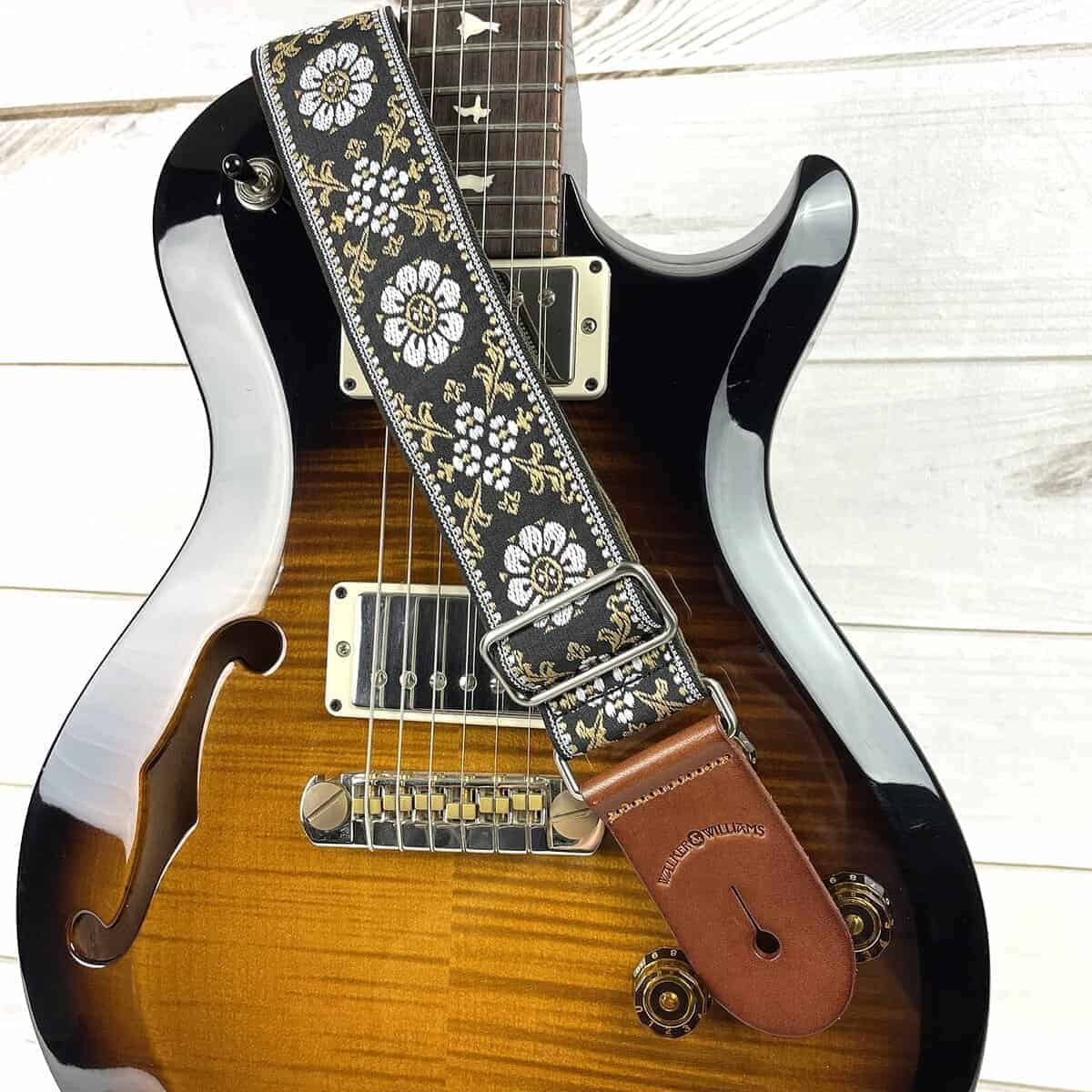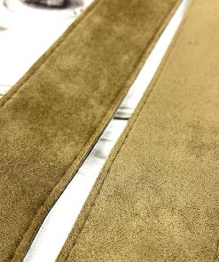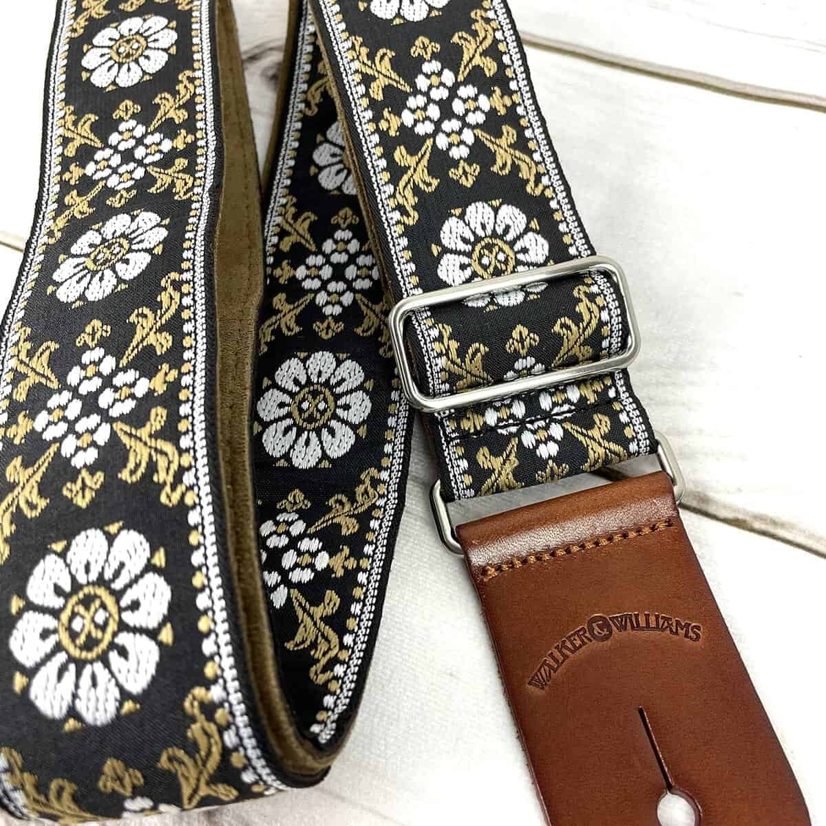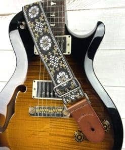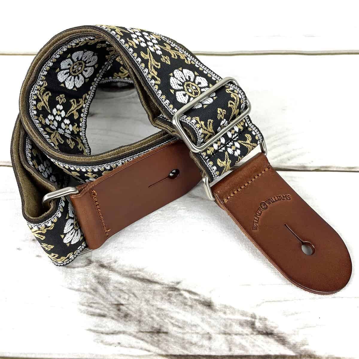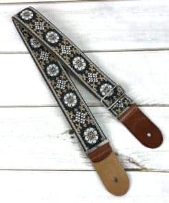 1. Diseño nuevo de mandala dorado y blanco sobre fondo negro. 2. Material de respaldo de peluche suave de alta calidad. 3. Tapas de extremo de cuero marrón de grano grueso. 4. Herrajes de níquel cepillado. 5. Extremos de doble costura. 6. Fondos de tapas de extremo suaves y redondeados. 7. Ancho de 2″. 8. Ajustable de 32″ a 55″