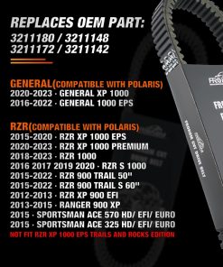 La Correa de Transmisión Frokom 3211180 es una opción excelente para tu Polaris RZR XP 1000 o RZR XP4 1000 de 2014 en adelante. Reemplaza los números de parte OEM 3211180, 3211148, 3211172 y 3211142 para garantizar la compatibilidad. Esta correa de transmisión resistente está diseñada para soportar altas temperaturas y es perfecta para aplicaciones de trabajo pesado donde la resistencia al calor es crucial, como neumáticos grandes, reducción de engranajes o un kit de embrague. Hecha de caucho cloropreno EPDM de alta calidad y reforzada con hilo de aramida, esta correa ofrece una fuerza y resiliencia superiores. Su diseño preciso del espaciado oclusal garantiza una transmisión suave y uniforme, reduciendo efectivamente el desgaste unilateral y prolongando la vida útil de la correa. Probada y comprobada por ingenieros y personal de campo, esta correa de transmisión ha demostrado ofrecer el mejor ajuste, rendimiento y durabilidad. Si experimentas cualquier problema de calidad, por favor contáctanos para devoluciones o intercambios.