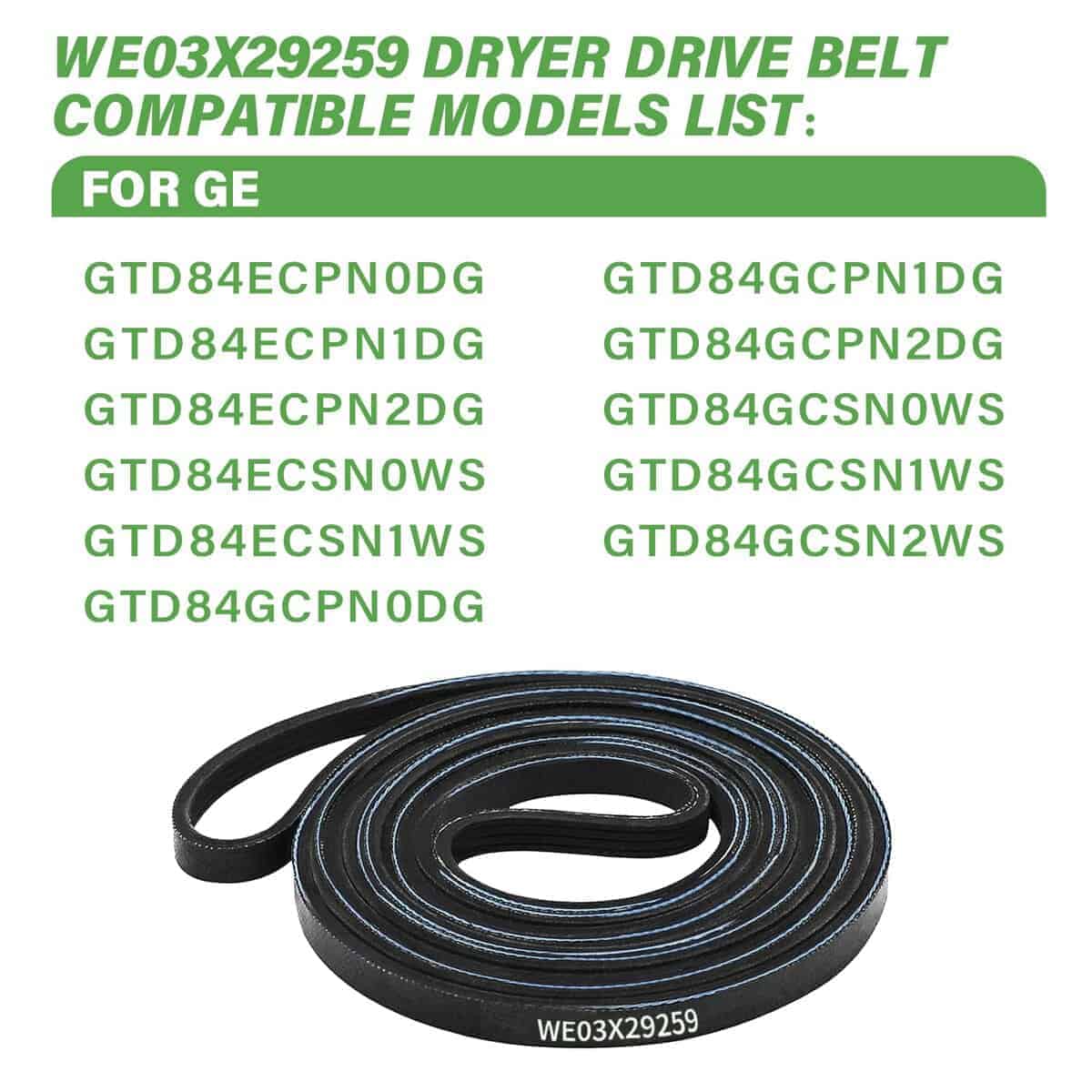La correa de transmisión para secadora WE03X29259 es compatible con secadoras GE como GTD84ECPN0DG, GTD84ECPN1DG, GTD84ECSN0WS, GTD84ECSN1WS, GTD84GCPN0DG, GTD84GCPN1DG, GTD84GCSN0WS, GTD84GCSN1WS. Esta correa de transmisión adopta materiales de alta calidad y ha sido probada cuidadosamente por el fabricante. Puede resolver eficazmente síntomas como la secadora gira mucho, muy lentamente o deja de girar, hace ruido o incluso provoca olores. Contáctenos para cualquier pregunta adicional o necesidades de otras partes de electrodomésticos. Nos esforzaremos al máximo para resolver el problema, ya que la satisfacción del cliente es nuestra búsqueda incansable.