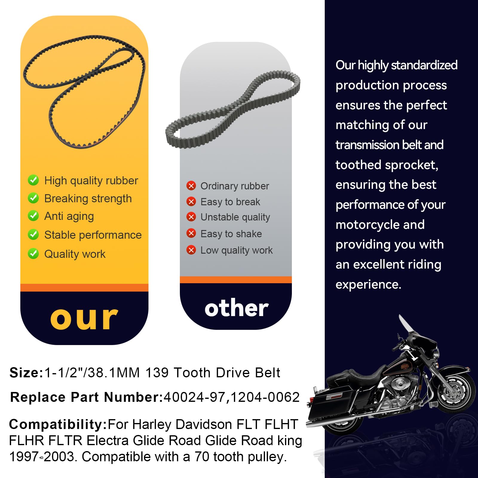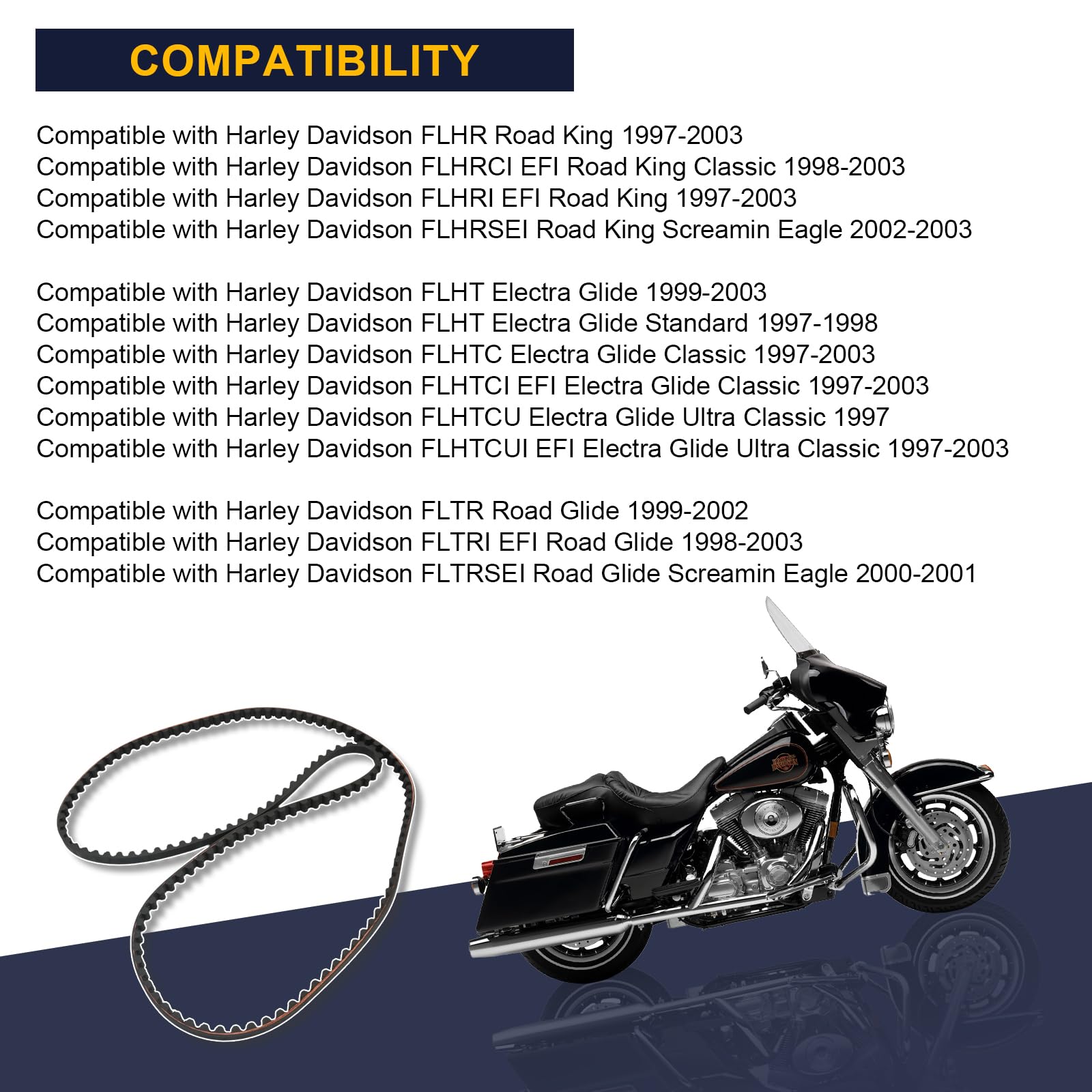 3. Compatibilidad: Para Harley Davidson FLT FLHT FLHR FLTR Electra Glide Road Glide Road king 1997-2003. Compatible con una polea de 70 dientes.