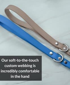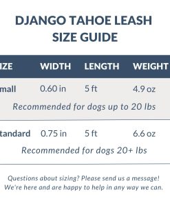 DJANGO Tahoe es una correa para perros impermeable y súper duradera diseñada para todo tipo de condiciones y terrenos. Hecha de cinta recubierta de alta calidad, la correa para perros Tahoe es 100% impermeable, resistente a la suciedad y al olor, y diseñada para durar. Nuestra cinta recubierta tiene un espesor de 3.6 mm, lo que la hace muy resistente y duradera. Los herrajes de metal plateado son hermosos y añaden resistencia adicional, funcionalidad y estilo al diseño moderno de la correa. El mosquetón de cierre premium y seguro garantiza una conexión fuerte y una salida segura con tu perro. Nuestra cinta personalizada es increíblemente suave al tacto y cómoda en la mano. La correa para perros impermeable Tahoe de DJANGO mide 5 pies de largo (60 pulgadas) y está disponible en dos tamaños, Pequeño y Estándar. El tamaño Estándar mide 0.75 pulgadas de ancho, pesa 6.6 onzas y se recomienda para perros que pesan más de 20 lbs (9 kg). El tamaño Pequeño mide 0.6 pulgadas de ancho, pesa 4.9 onzas y es el mejor para razas de perros pequeñas y cachorros que pesan menos de 20 lbs. En DJANGO, estamos comprometidos a ofrecer equipo para perros de alta calidad que dure. Nos asociamos con proveedores de renombre mundial e inspeccionamos cuidadosamente cada artículo para garantizar la calidad antes de que llegue a tu puerta. Si tienes alguna pregunta o no estás satisfecho de alguna manera, ¡contáctanos! ¡Nos encantará saber de ti!