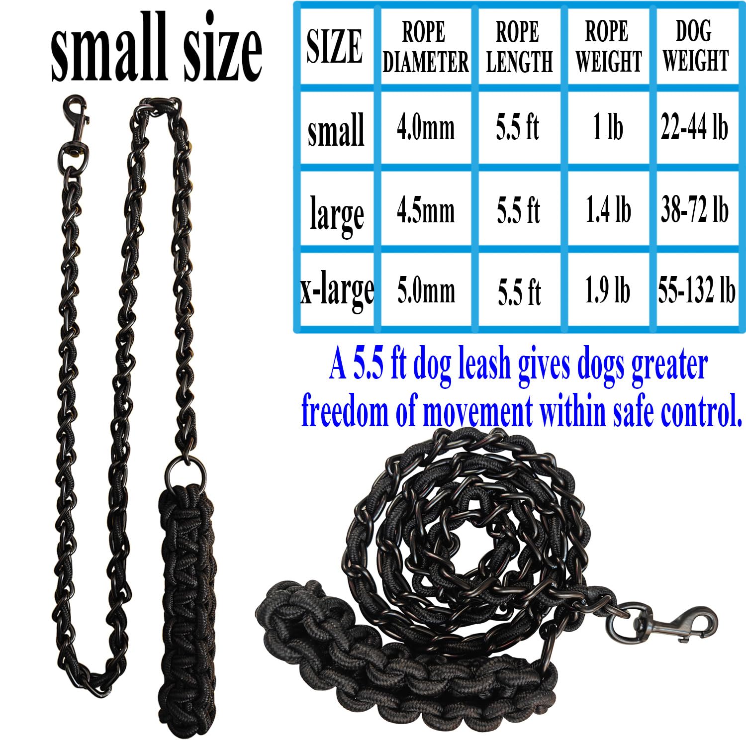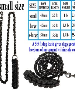 La correa para perros consta de una cadena sólida cromada y una cuerda de nylon entrelazada, con un brillante brillo metálico y una cuerda negra, se ve tan genial y deslumbrante. Te ayudará a ti y a tu perro a destacar al aire libre o en la arena. La correa para perros resistente es especialmente adecuada para perros grandes como dobermans, boxeadores, pastores alemanes, huskies, labradores, etc. CARACTERÍSTICAS 1. Material: cadena sólida cromada y cuerda de nylon entrelazada. 2. Apto para perros medianos y grandes. 3. Longitud de la cuerda: 5.5 pies. 4. Gancho giratorio de 360 grados. 5. Collar para perros gratis. Contenido del paquete: 1 x correa para perros, 1 x collar para perros (gratis). Agrega nuestra resistente correa para perros a tu carrito. Si tiene algún problema o simplemente no le gusta, garantizamos el cambio o reembolso al 100%.