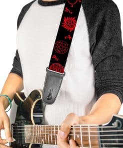 Correa para guitarra Buckle-Down – Símbolos sobrenaturales dispersos Negro/Rojo – 2″ de ancho – Longitud de 29-54″