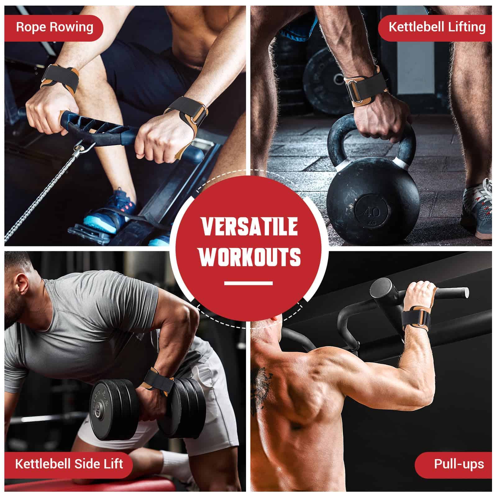 4. Socio perfecto de fitness: Las correas de entrenamiento para muñecas son ideales para levantamiento de pesas, entrenamiento de fuerza, culturismo, dominadas, tirones duros, encogimientos, remo con barra y remo erguido. No solo es la gamuza de vaca que absorbe el sudor y antideslizante, sino que también está construida para resistir hasta 480 lbs sin rasgarse. Las correas de muñeca pesan solo 0.5 libras, por lo que puedes llevarlas contigo, usándolas en casa, en el gimnasio o al aire libre.