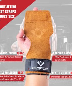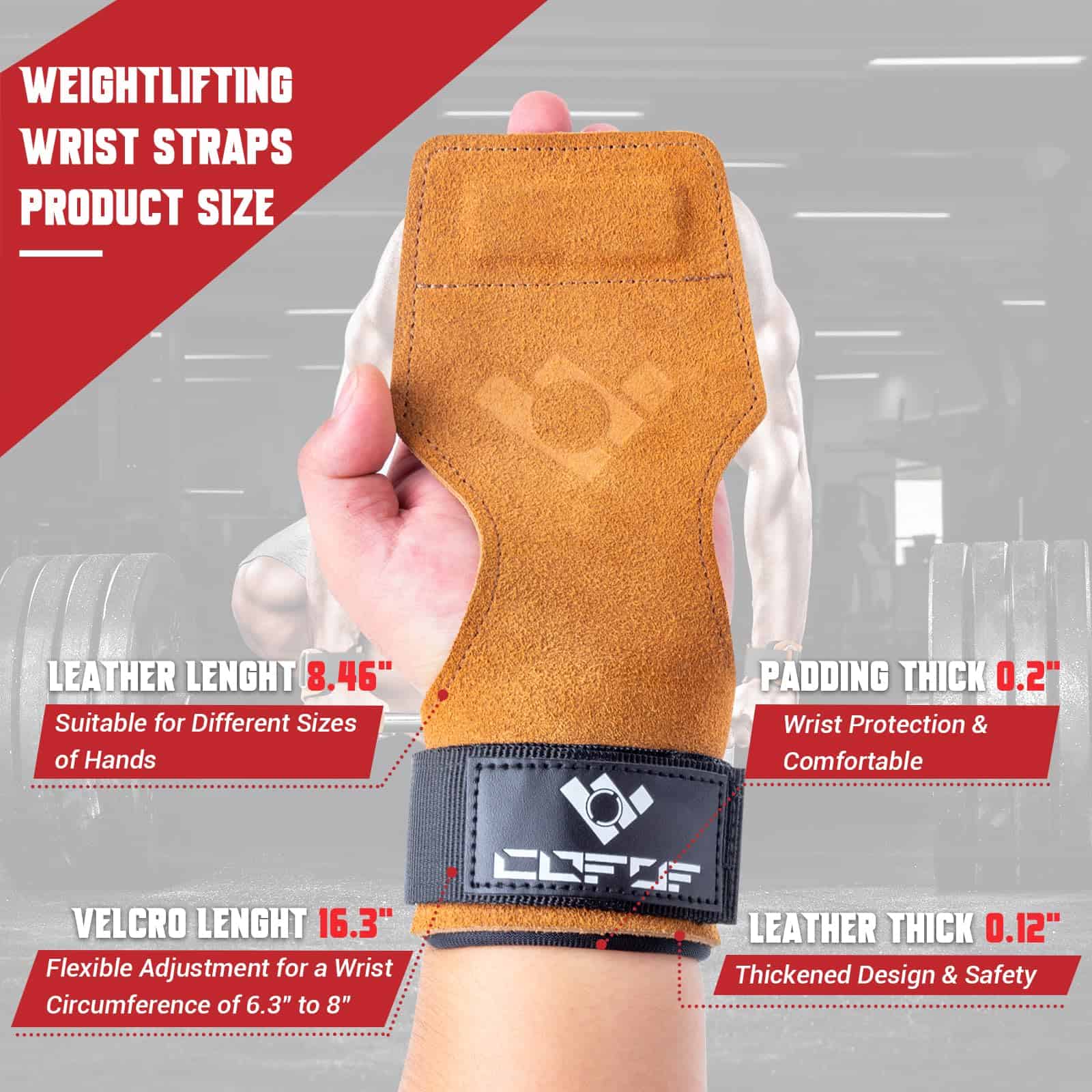 3. Tamaño perfecto de las correas para levantamiento de pesas: El cuero de nuestras correas de ganchos para muñecas de gimnasio tiene 8.46 pulgadas de largo y puede adaptarse a palmas de diferentes tamaños. El cuero con diseño de doble capa de costura tiene un grosor de 0.19 pulgadas, no solo es suave sino también seguro y cómodo. El acolchado de neopreno tiene 7.48 pulgadas de largo, 2.56 pulgadas de ancho y 0.2 pulgadas de grosor para proteger mejor la muñeca de lesiones. La longitud ajustable del cierre de gancho y bucle de alta densidad es de 16.7 pulgadas y se adapta a circunferencias de muñeca de 6.3 pulgadas a 8 pulgadas.