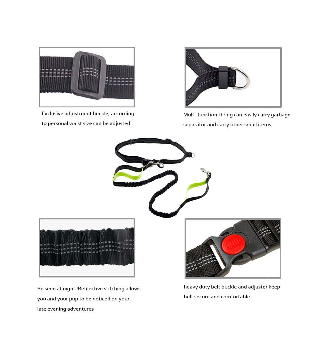 5. Talla única para todos: Con el cinturón de cintura ajustable, que se puede ajustar de 29″ a 49″, no es necesario preocuparse por si está suelto o apretado, también se puede ajustar la correa, ajustable hasta 75″ para proporcionar suficiente libertad para ti y tu perro.