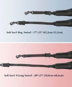La revolucionaria correa de saxofón suave ayuda a reducir la presión incómoda en el cuello y los hombros, la fatiga y el rebote. El diseño innovador combina neopreno con un respaldo de estiramiento cómodo. Esta combinación permite que el peso de tu instrumento se distribuya de manera uniforme sobre una área más grande en tu cuello y hombros, absorbiendo el shock de tus movimientos. Así es como la correa de saxofón suave hace que tu instrumento se sienta un 50% más ligero y un 100% más cómodo. ¡Definitivamente sentirás la diferencia! La correa de saxofón suave está disponible en tres tamaños: regular: 17″ 21″ (43, 2cm 53, 3cm) – versión de bucle: 16. 5″ 19. 25″ (41, 9cm 48, 9cm) junior: 16″ 19″ (40, 6cm 48, 3cm) extra-larga: 19″ 26″ (48, 3cm 66cm) – versión de bucle: 18. 5″ 21. 25″ (47Cm 54cm) Las medidas se toman desde la parte posterior del cuello hasta la parte inferior del gancho.