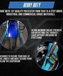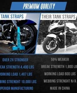 STRONGEST ON THE MARKET: Tank Straps son las correas de amarre para motocicleta con trinquete más resistentes que puedes comprar. 10,000 lb MAX STRENGTH WEBBING: Nunca empujes los límites de tus correas, obtén Tank Straps porque son más que suficientes. PERFECTO PARA TODAS LAS MOTOCICLETAS: Tank Straps se han utilizado para todos los modelos, incluyendo Harley Davidson, Ducati, Honda, Suzuki, Kawasaki, Yamaha. NO RAYARÁ TU MOTO: El diseño de bucle infinito significa que no hay ganchos de metal que puedan rayar tu metal o pintura. 100% GARANTIZADO: Si no estás 100% satisfecho con Tank Straps, te devolveremos tu dinero.