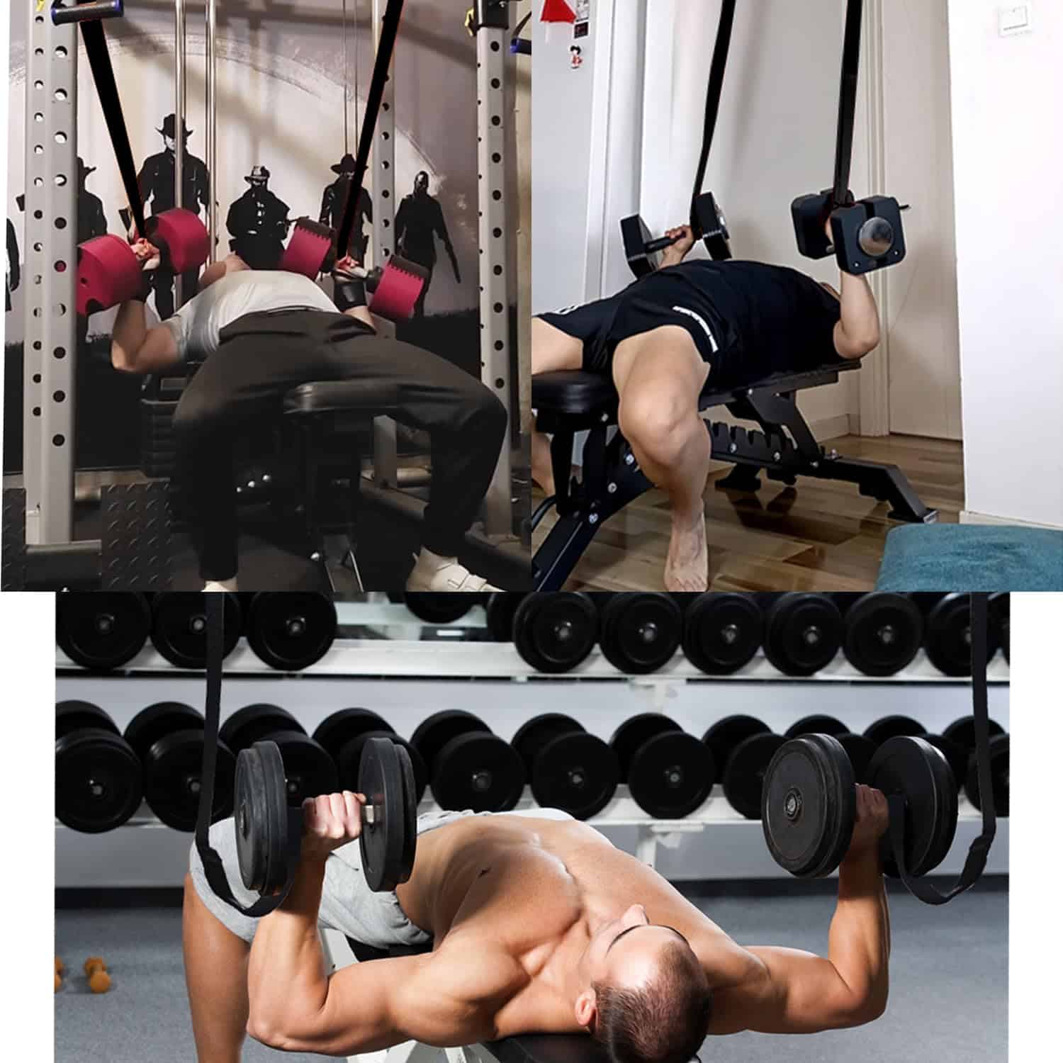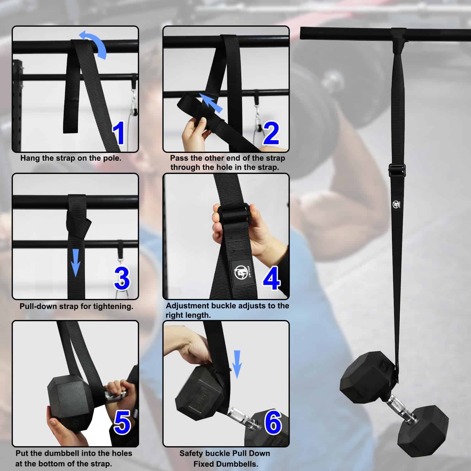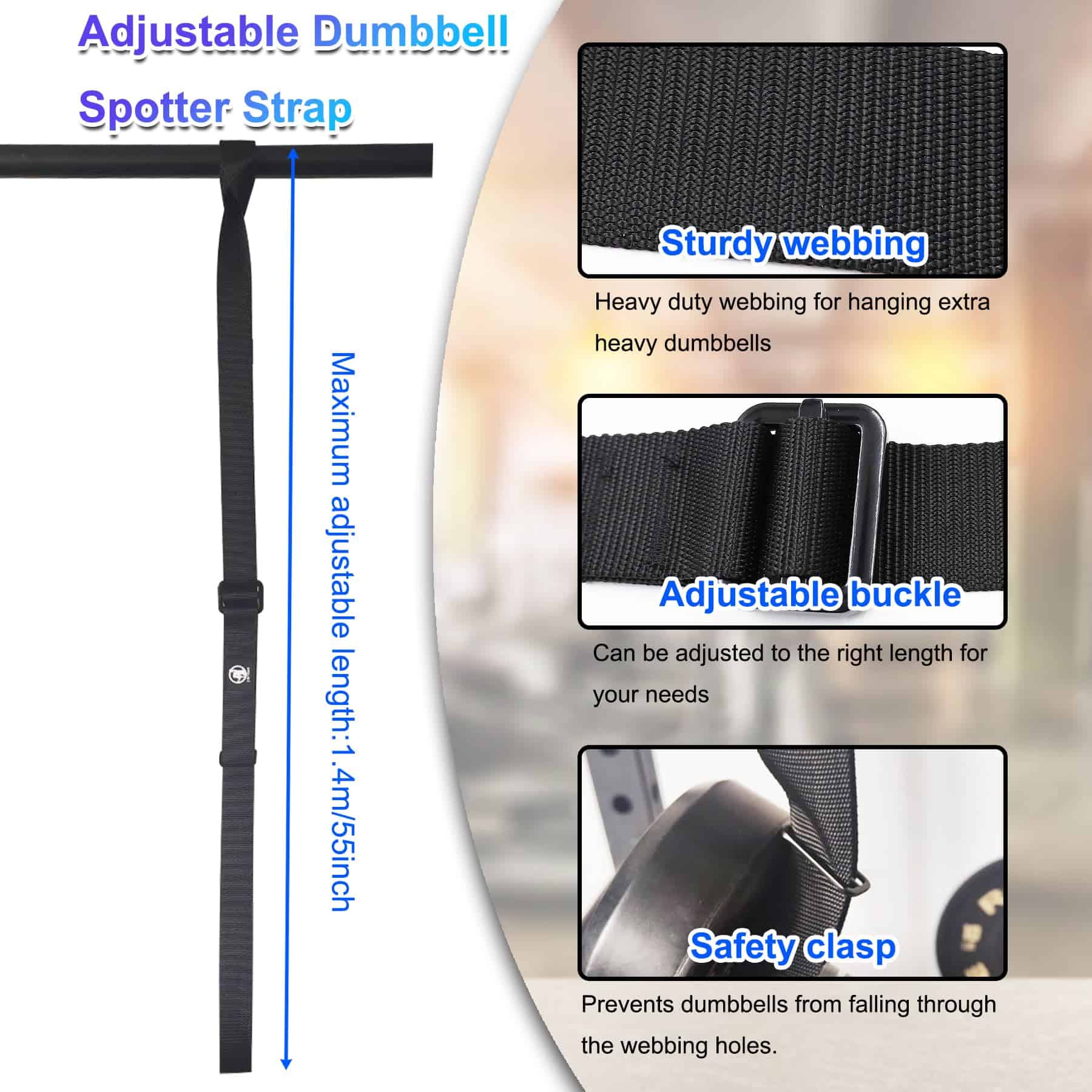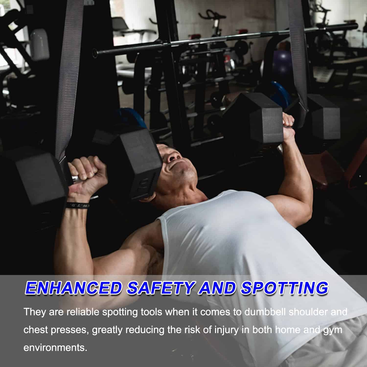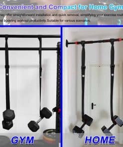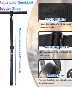 Las correas de fijación de mancuernas ofrecen una seguridad superior y son especialmente adecuadas para ejercicios de empuje de hombros y pecho. Actúan como una herramienta de apoyo confiable, reduciendo significativamente el riesgo de lesiones en casa o en un entorno de gimnasio. Se cuelga fácilmente de la mayoría de las barras y racks, como racks de sentadillas o barras de dominadas en casa, lo que hace que sea rápido y fácil de configurar y adecuado para una variedad de escenarios de entrenamiento y equipamiento.