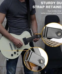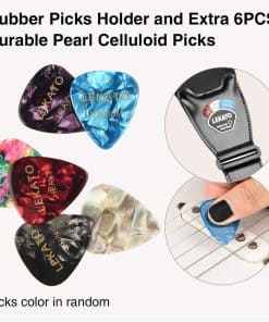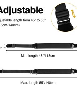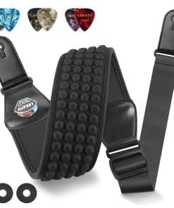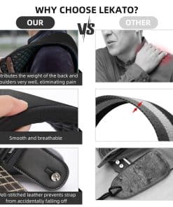 La correa para guitarra LEKATO de 3 pulgadas de ancho con relleno de esponja 3D y material de neopreno con extremos de cuero cosido de primera calidad funciona bien con guitarras pesadas, guitarras eléctricas, bajos, etc. Esta es la correa de tamaño regular que ofrece un amplio rango de ajuste de 45 a 55 pulgadas. Es duradera y alivia la presión, se ve increíble en cualquier estilo de guitarra que toques. Características: Flexible, transpirable y que absorbe la humedad. La correa colgante de guitarra hecha para tu seguridad. Increíblemente suave, acolchada y cómoda de llevar. Distribución uniforme del peso, gran reducción de la presión en el cuello. Material de neopreno de alta calidad que no cortará en tu cuello. Se ve increíble en cualquier estilo de guitarra que toques. Especificaciones: Rango de longitud: Correa de guitarra ajustable de 45 pulgadas a 55 pulgadas Grosor: Grosor de la correa para el hombro de la guitarra de descompresión de 0,53 pulgadas. Grosor de la cabeza de cuero de 0,16 pulgadas. Material: Relleno de esponja 3D, material de neopreno. Paquete: 1 Correa para Guitarra, 6 Púas para Guitarra, 2 Seguros de Correa, 1 Cuerda de Accesorio Adicional.