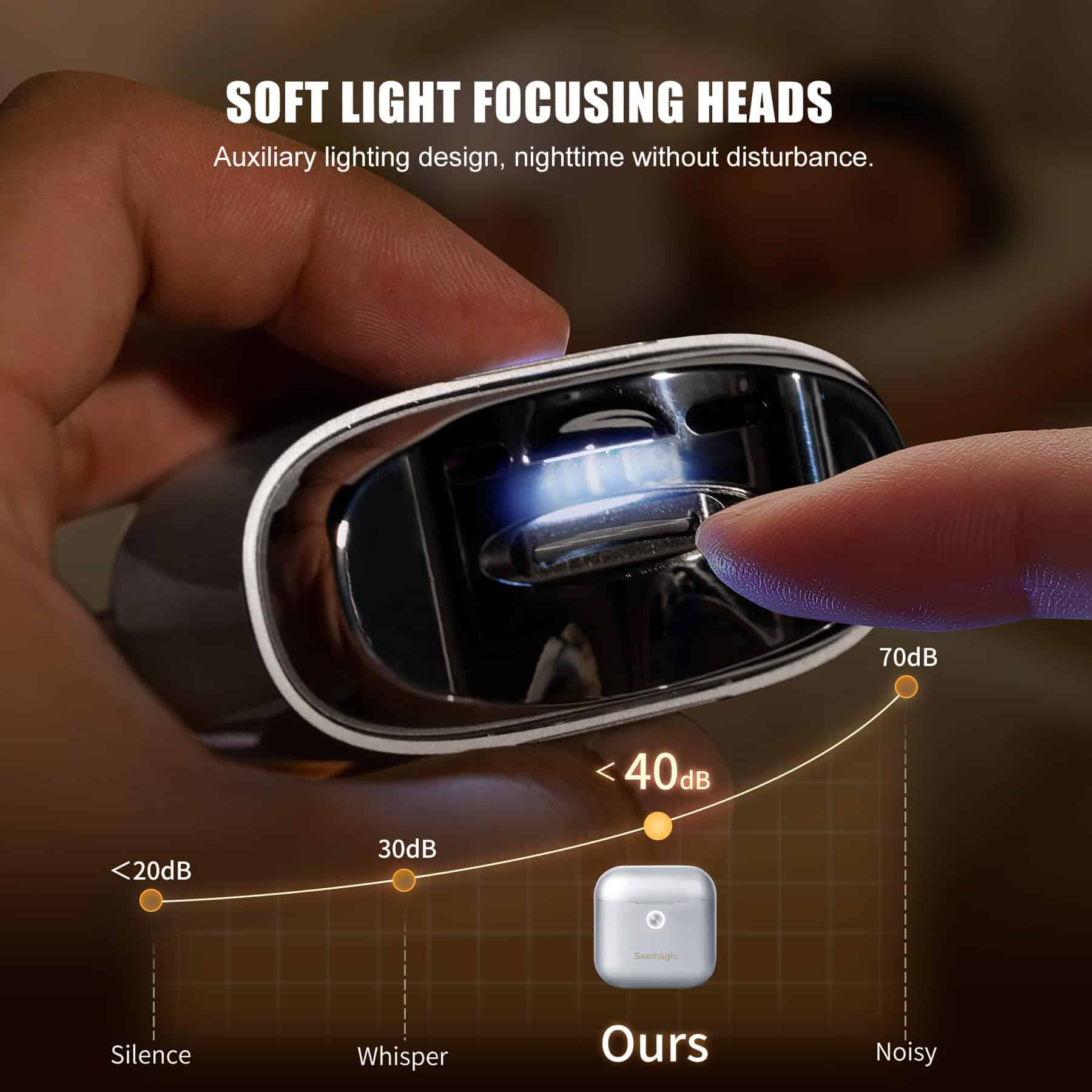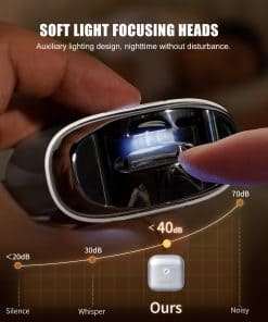 2. Iluminación LED y Operación silenciosa: Este cortauñas para bebés está diseñado para operar a un nivel de ruido bajo de solo 40 decibeles, perfecto para recortar las uñas sin molestar a su bebé u otros miembros de la familia. El diseño de cortauñas añade iluminación auxiliar de luz suave para que pueda recortar las uñas de forma segura incluso en ambientes oscuros.