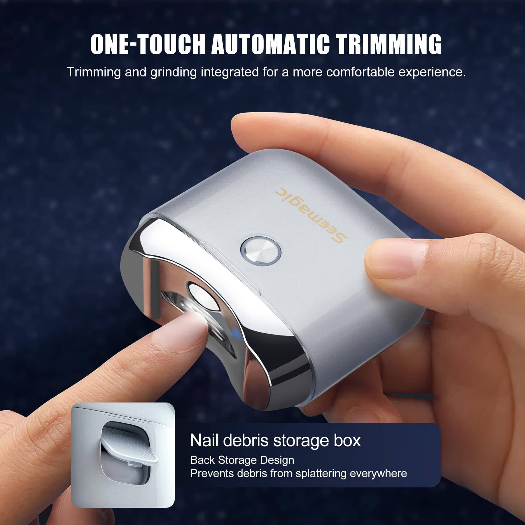 1. Cortauñas eléctrico seguro y eficiente: Este cortauñas eléctrico está diseñado para facilitar su uso y comodidad, con funcionamiento de un solo toque y ajustes de doble velocidad para un uso sencillo. La cuchilla está inteligentemente oculta dentro de una ranura curvada, mientras que el cortador empotrado garantiza una separación perfecta de las uñas, todo manteniendo la seguridad.