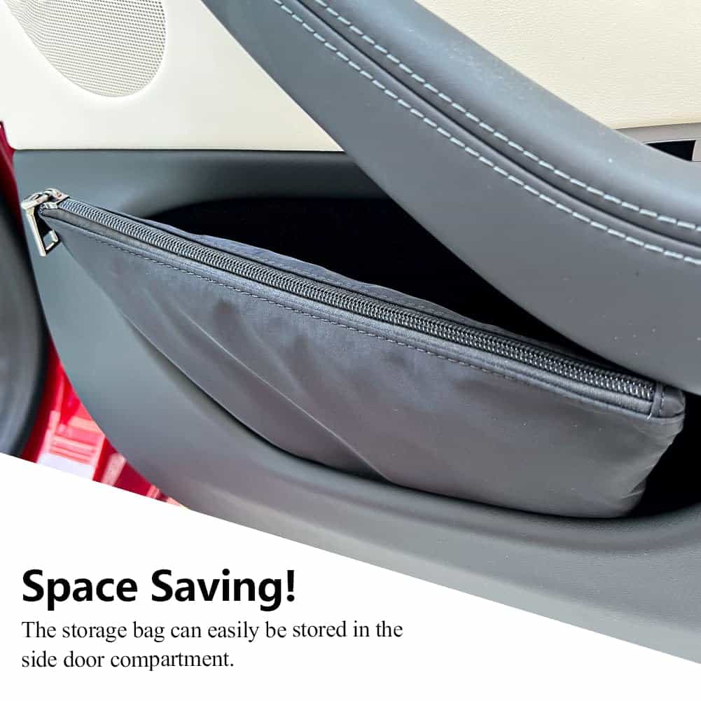 3. Ahorro de espacio: cuando no necesites utilizar la cortina de privacidad del Tesla Model 3, simplemente dóblala y guárdala en la bolsa pequeña que proporcionamos. Puedes poner la bolsa en el espacio de la puerta lateral y siempre estará a mano.