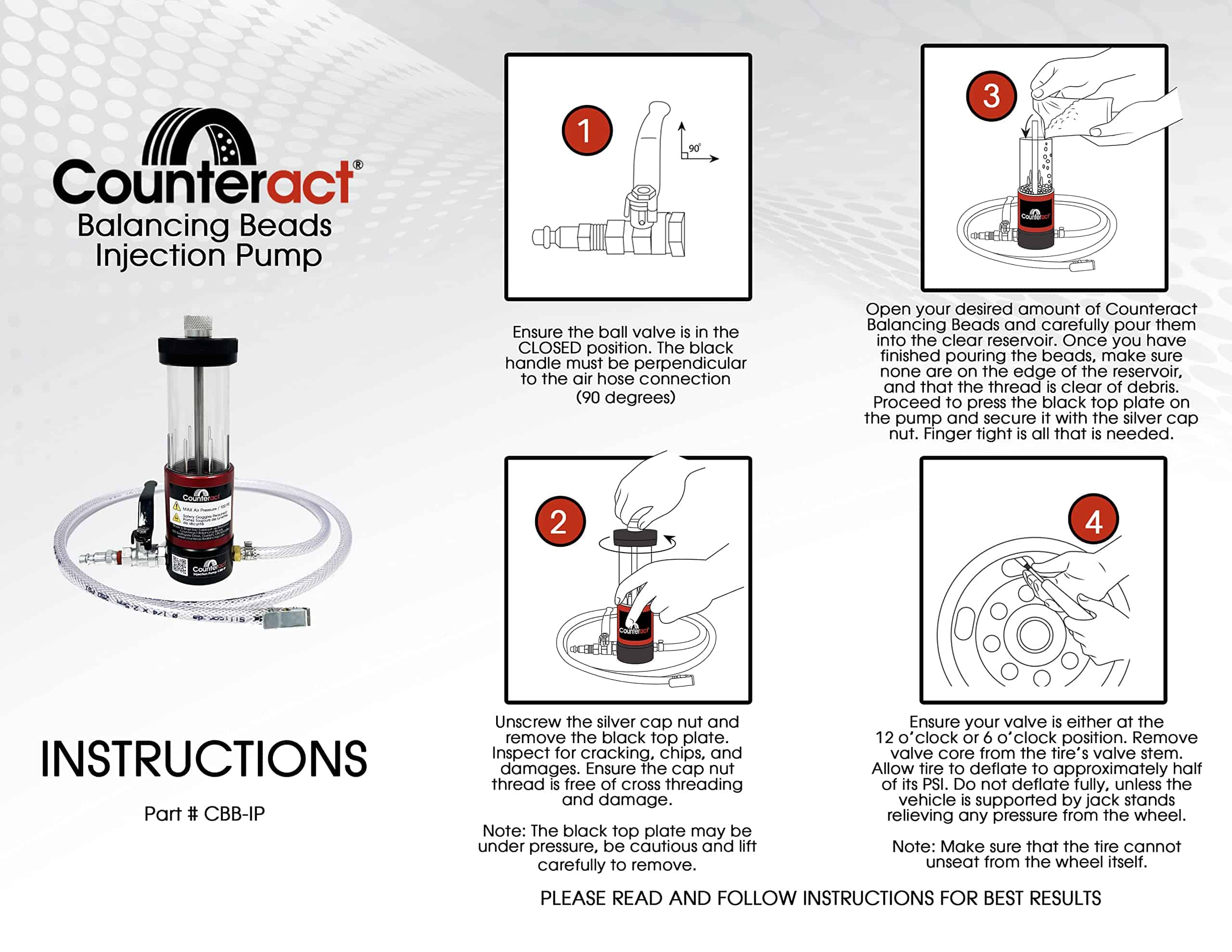 Counteract u otro producto interno de equilibrado de neumáticos NO es recomendado para su uso en coches pequeños de pasajeros (como un Honda Civic, Crossovers pequeños, SUV, etc.). Este producto solo se recomienda en vehículos con una suspensión de 1/2 tonelada en adelante, vehículos todo terreno, motocicletas, ATV, UTV, vehículos comerciales, autobuses, RV y más. Counteract Balancing Beads es el único producto de equilibrio de neumáticos y ruedas completo en el mercado probado para mejorar la economía de combustible en dos pruebas S.A.E. y TMC tipo II por separado. Las perlas de equilibrio de Counteract están fabricadas como perlas de vidrio templado que se colocan dentro de un neumático o se inyectan a través de la válvula de la llanta, permitiendo un equilibrio completo del conjunto de rueda y neumático sin la necesidad de usar contrapesos externos en la rueda. Counteract prolonga la vida del neumático, mejora la economía de combustible, equilibra el conjunto completo de ruedas, disminuye la vibración y la fatiga del conductor, dura toda la vida del neumático y es amigable con el medio ambiente. Los kits de bricolaje incluyen todo lo que necesitas para instalar el producto en casa a través de la válvula de la llanta. Si estás montando neumáticos nuevos, cada bolsa de Counteract de 4 oz y más es un sistema de bolsas de colocación. Simplemente abre tu bolsa de perlas de equilibrio Counteract y coloca la bolsa interior transparente que contiene Counteract dentro de la cavidad del neumático mientras se está montando. Una vez que el neumático esté sellado y montado en el vehículo, la bolsa se romperá por sí sola cuando el vehículo comience a moverse.