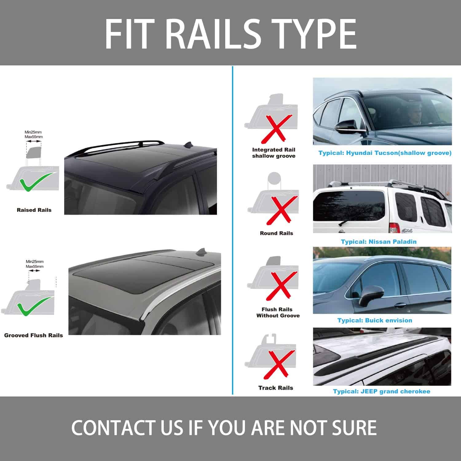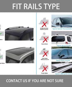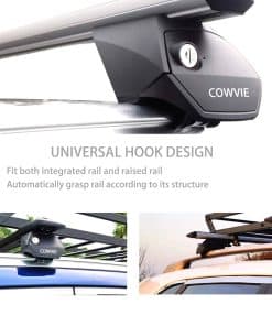 Las Barras Transversales para Rejilla de Techo de Cowvie están diseñadas con pies de gancho universales, que se ajustan a la mayoría de SUVs o vehículos con rieles laterales elevados o rieles integrados (apto para un ancho de riel de 0.8″ a 2.16″). Estas barras transversales ideales son perfectas para cargar accesorios de techo como equipaje, tabla de snowboard, bicicleta, kayak, esquí, tabla de surf, etc.