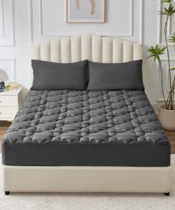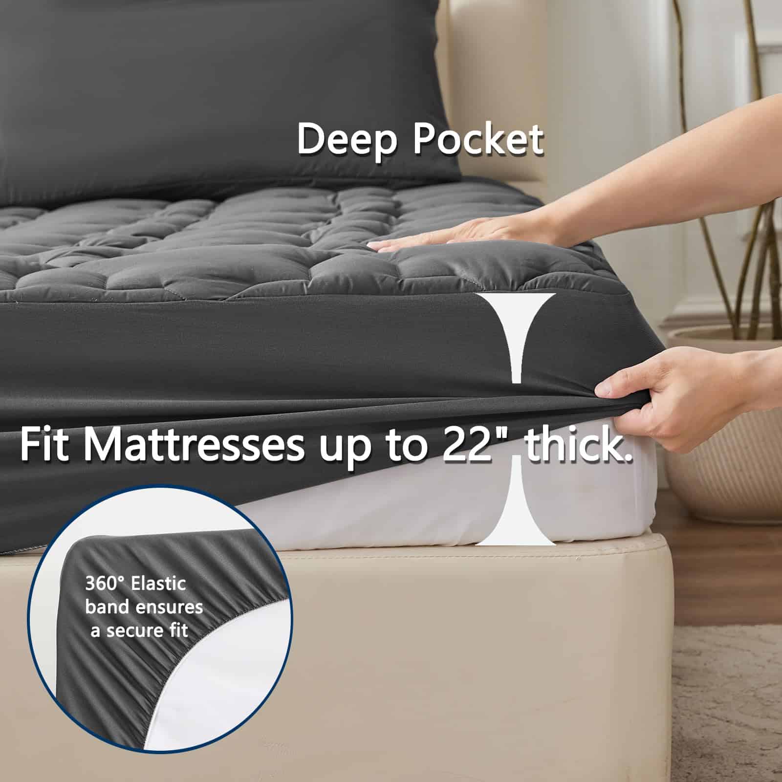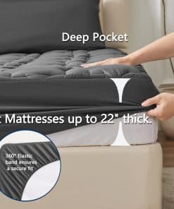 3. Diseño Elaborado: La tecnología de acolchado profesional garantiza una estructura duradera que proporciona un servicio extra duradero. El elegante patrón de hexagrama puede agregar un toque fresco al aspecto de cualquier dormitorio. El bolsillo elástico profundo se estira para adaptarse a un colchón de hasta 18″ de profundidad que siempre puede mantenerse antideslizante sin importar cómo te retuerzas en tu cama.