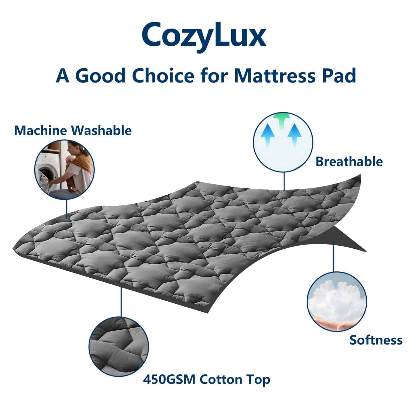 4. Fácil Cuidado: Las colchonetas/fundas de colchón son lavables a máquina, lo cual puede ahorrarte más tiempo y energía. Para suavidad durante todo el año y evitar que se agrupe, se recomienda lavarlo en ciclo suave con agua fría, secarlo al sol o secar a baja temperatura cuando sea necesario. Deja que nuestras colchonetas de algodón sigan proporcionándote a ti y a tu familia un sueño acogedor.