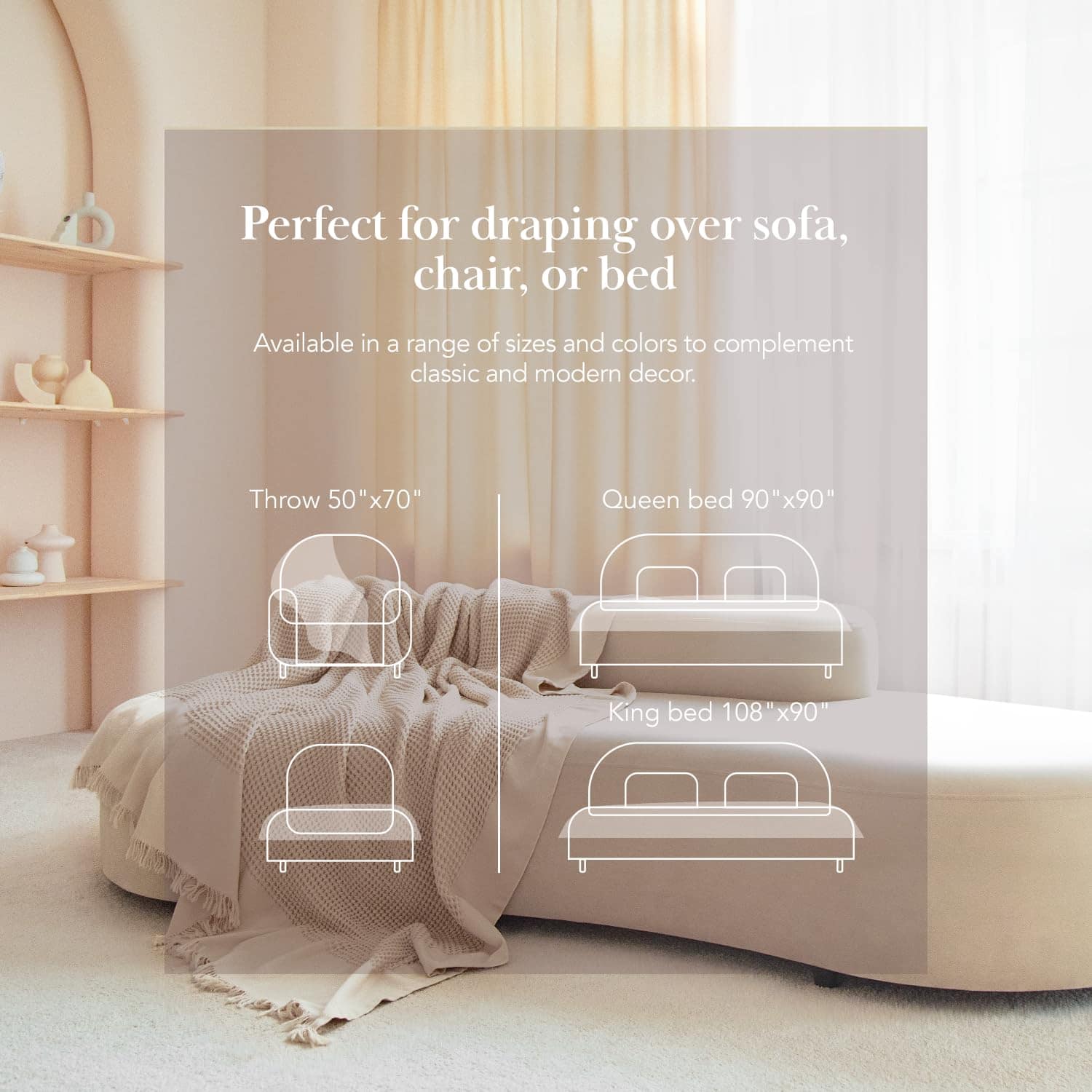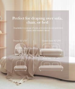 3. SUAVE Y ACOGEDORA: Nuestras mantas de tejido de gofre son extra suaves y ligeras. Vienen en tres tamaños para adaptarse a tus preferencias: una manta de sofá de tamaño generoso, una queen y una king.