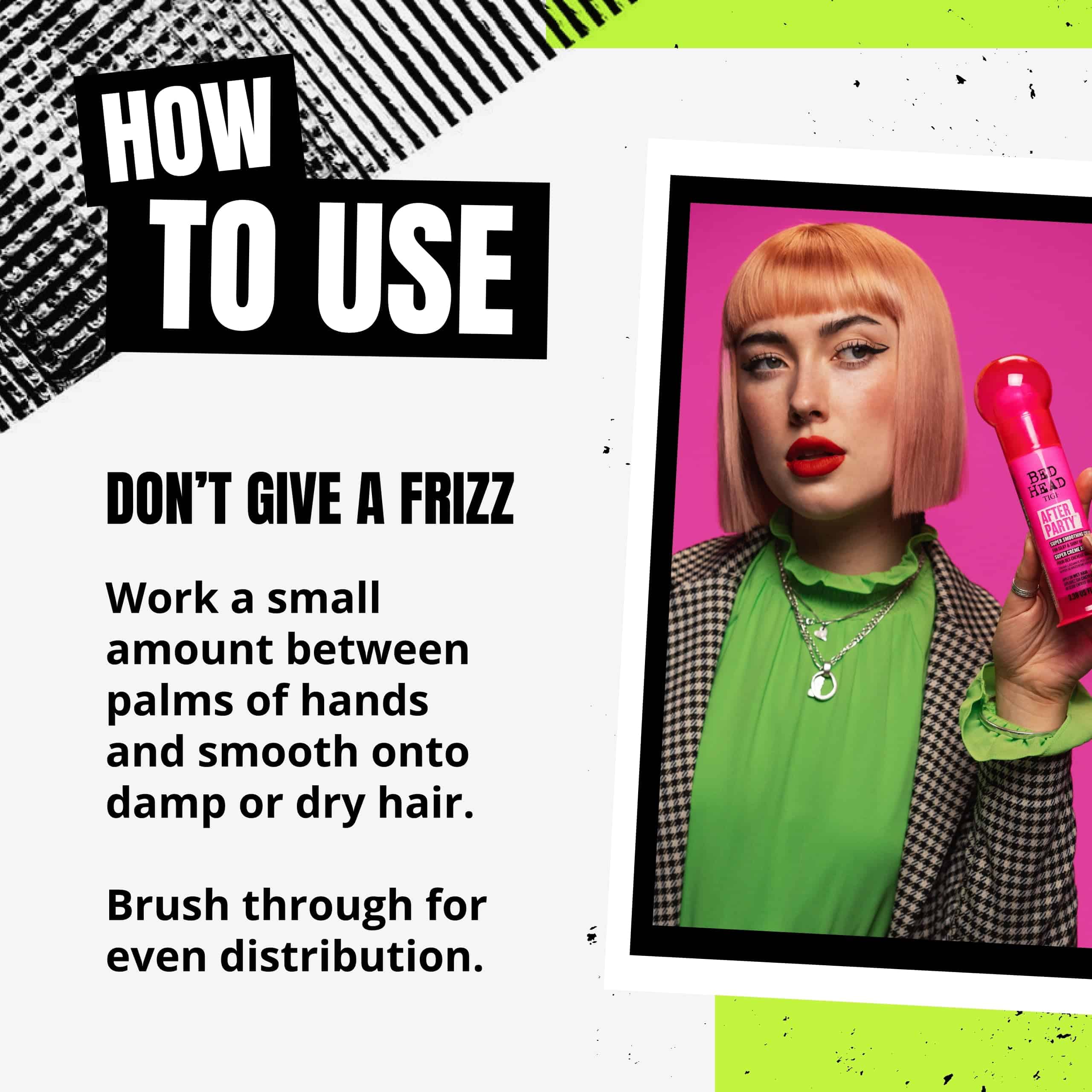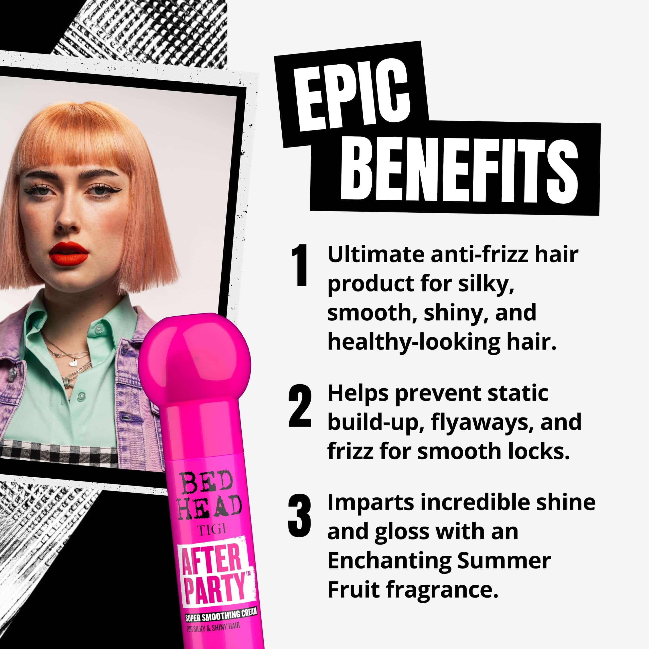 Para estilistas profesionales y consumidores por igual, la Crema Alisadora After Party de Bed Head es el último producto para el cabello anti-frizz. La Crema Alisadora After Party está diseñada por un equipo de profesionales y deja el cabello brillante y brillante mientras previene la acumulación de electricidad estática, el cabello suelto y el frizz. Esta ligera crema alisadora para el cabello es perfecta para todo tipo de cabello, especialmente el encrespado, apagado y grueso. El producto para el cabello brillante también imparte un brillo increíble mientras previene la acumulación de electricidad estática. Formulada con acondicionadores ligeros, complejo anti-frizz, potenciador del brillo y aceite de semilla de ricino, esta crema alisadora alisa los cabellos sueltos y estáticos, se defiende contra los efectos sorprendentes de la humedad y ayuda al cabello a reflejar el brillo de manera más uniforme. Esta crema de cabello sedoso tiene una fragancia encantadora a frutas veraniegas que huele genial. Nuestra crema es fácil de usar sin necesidad de calor o peinado. La After Party se puede usar para finalizar su look aplicando una pequeña cantidad en el cabello seco. También se puede usar en cabello húmedo y dejarlo secar al aire para un estilo súper sin esfuerzo. Bed Head fue establecido en los años 90 como la marca original de cabello rebelde, desafiando la estética pulida de la peluquería en ese momento. Ahora, Bed Head ha dado un refrescamiento a su gama de productos icónicos manteniendo nuestro ethos creativo y profesional. Hemos creado nuevos productos para el cuidado del cabello con el Equipo Creativo de TIGI, diseñados para ser utilizados por estilistas profesionales y consumidores por igual, entregando resultados fenomenales en el salón y en casa. Hemos dado forma a nuevos envases audaces, inspirándonos en diversas subculturas juveniles con el objetivo de conectarnos con nuestros clientes a través de la música, la moda, la tecnología y el arte. Nuestro propósito es liberar la creatividad a través de nuevos productos increíbles. En Bed Head, defendemos la creatividad al inspirar a otros a expresar su individualidad sin arrepentimientos. Por lo tanto, en Bed Head creemos que si quieres ser gobernado por algo, ¡que sea tu creatividad! ¡Que tu creatividad gobierne!