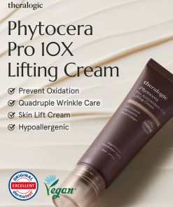 ADVANCED SLOW-AGING TECHNOLOGY: Embrace the pinnacle of skincare innovation with Theralogic’s Phytocera Pro Antioxidant 10X Lifting Cream, a vegan, dermatologically tested marvel designed to dramatically improve facial contouring. Achieve a 125% increase in facial lift, 106% in skin elasticity, and a 107% improvement in the appearance of wrinkles through our meticulously formulated blend of six compound ceramides and a dual phyto complex, promoting a radiant, youthful complexion. DEEP HYDRATION AND LIFTING: This luxurious cream is fortified with 6D Ceramide, Phytosterol, and Phytocollagen from white wood ear mushrooms, enhancing the skin’s moisture barrier, providing antioxidant benefits, and delivering low molecular weight vegetable collagen for unparalleled elasticity and hydration. Our Liquid Crystal Layer System ensures fast absorption and forms a protective film, offering intense care for smooth, glossy lifting and high-density elasticity. RICH, NOURISHING INGREDIENTS: Infused with a high concentration of 30,000 ppm shea butter for supreme moisture and Aginon extract for its elasticity and rejuvenation properties, the Phytocera Pro Lifting Cream creates a synergy that leaves skin with a smooth gloss and firm lift. Triple hyaluronic acid and vegetable moisturizing components further balance oil and moisture levels, providing deep, lasting hydration. TARGETED APPLICATION FOR MAXIMUM EFFECT: Leverage the power of this soft, elastic cream formulation by applying it along the skin’s texture to areas needing intensive care, such as around the eyes, nasolabial folds, and neck. Its dense, non-sticky texture smoothly envelops the skin in rich nutrition, maximizing effectiveness with an elastic massage to promote absorption and deliver immediate lifting results. THERALOGIC BRAND EXCELLENCE: As a pioneering derma cosmetic brand in South Korea, Theralogic stands at the forefront of dermatological innovation. Backed by the collective wisdom of 50 dermatologists and based on 400,000 cumulative skin data points, our products are meticulously formulated for the natural health and beauty of your skin. With a commitment to quality and stability, Theralogic embodies the essence of authentic derma skincare.