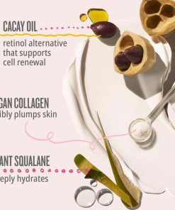 Ingredientes Clave: Aceite de Cacay: Un alternativa al retinol que apoya el proceso de renovación celular y promueve los niveles naturales de humedad de la piel, sin los efectos secundarios irritantes comunes para la piel o aumento de la sensibilidad al sol. Colágeno Vegano: Nuestra mezcla de aminoácidos certificada como vegana ayuda a mantener el suministro natural de colágeno de la piel para una apariencia y sensación de piel saludable. Escualano Vegetal: Al instante rellena la apariencia de la piel, hidrata profundamente y previene la pérdida de humedad mientras promueve la flexibilidad y la resistencia.