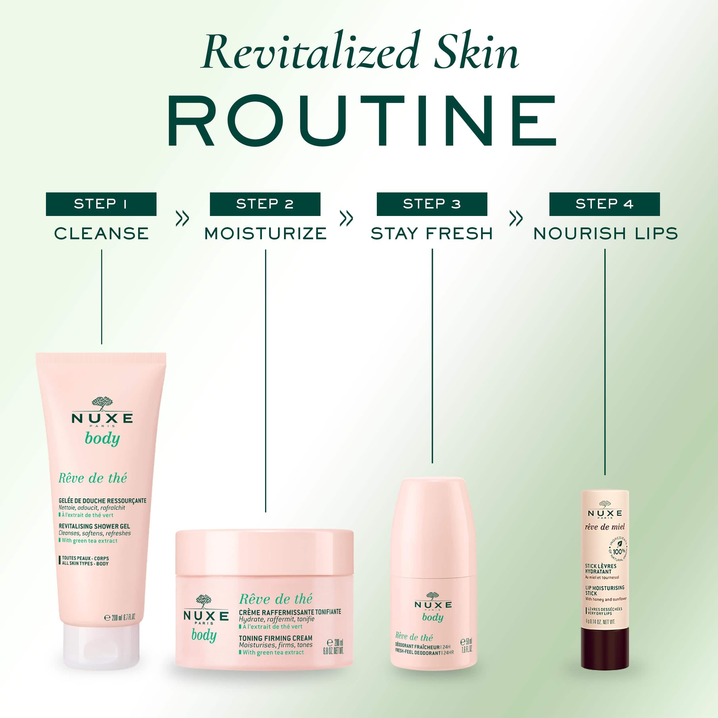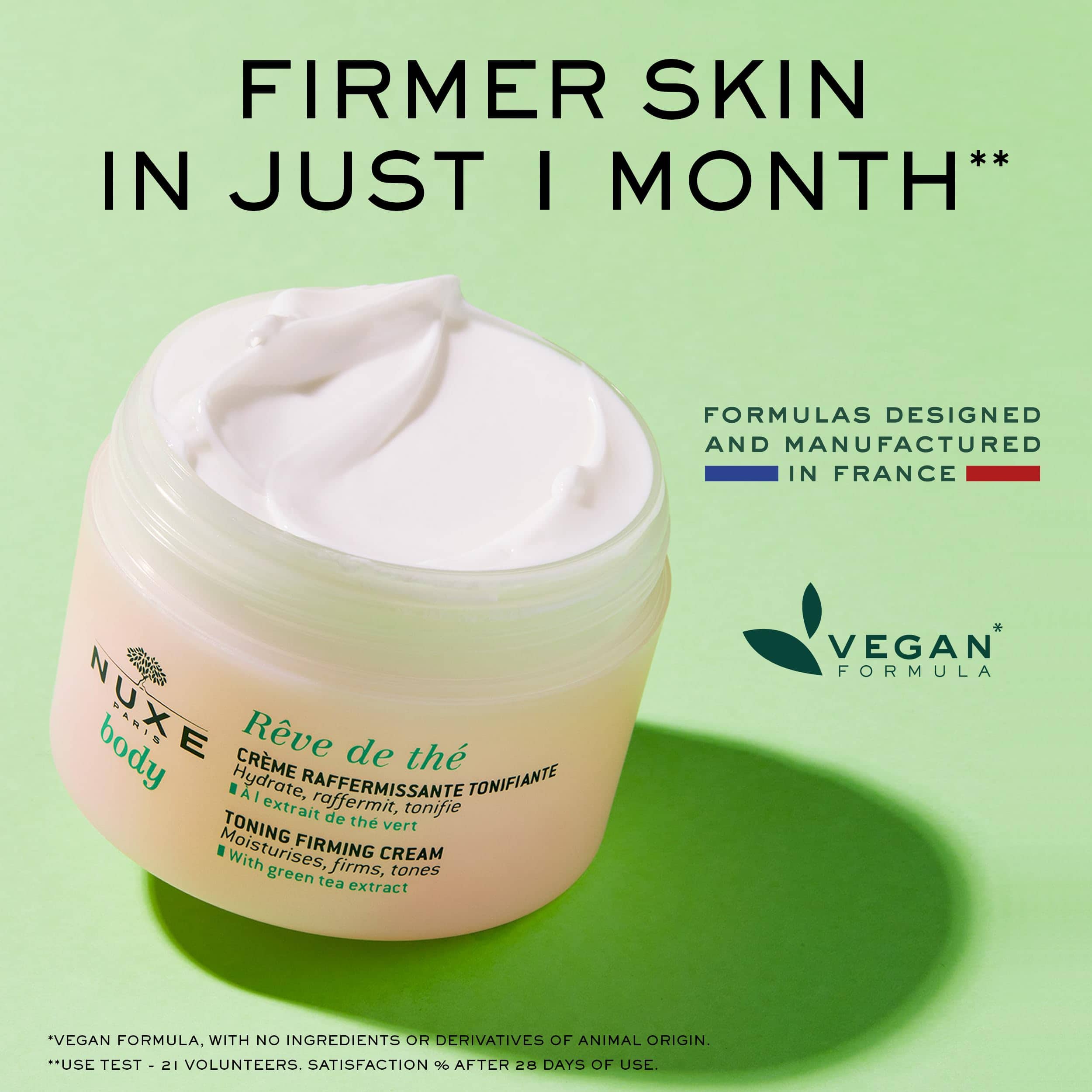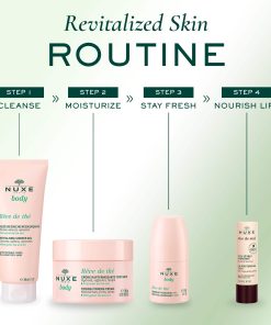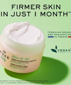 Crema corporal ultra-reafirmante Nuxe Rêve de Thé enriquecida con extracto de té verde y centeno para una piel tonificada, hidratada y reafirmada. Con un 96% de ingredientes naturales, esta crema ofrece una experiencia de cuidado de la piel segura y suave. Su fórmula se absorbe rápidamente en la piel, proporcionando una agradable sensación de enfriamiento y tonificación. Además, su fragancia delicada ofrece un efecto calmante y relajante para la mente y el cuerpo. Fabricada en Francia con una formulación de alta calidad y procesos de producción de cuidado de la piel.