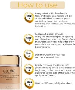 GLO24K es la crema de noche perfecta para regenerar y recargar tu piel mientras duermes, logrando una apariencia radiante y sin imperfecciones al día siguiente. Enriquecida con ingredientes estrella para combatir el envejecimiento como el Oro de 24k, Retinol y Ácido Hialurónico, esta crema hidratante nocturna mantendrá tu piel óptimamente hidratada, revitalizada y flexible. Aplicación: Aplica diariamente en rostro y cuello limpios. Masajea hasta que se absorba por completo. PARA TODO TIPO DE PIEL.