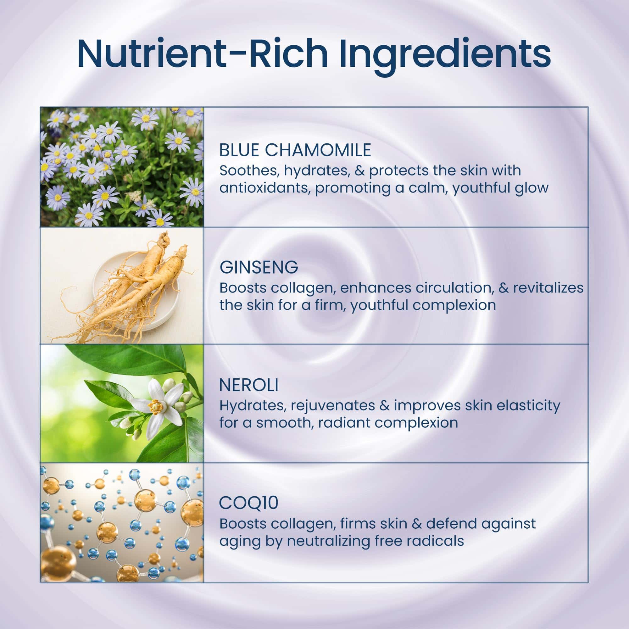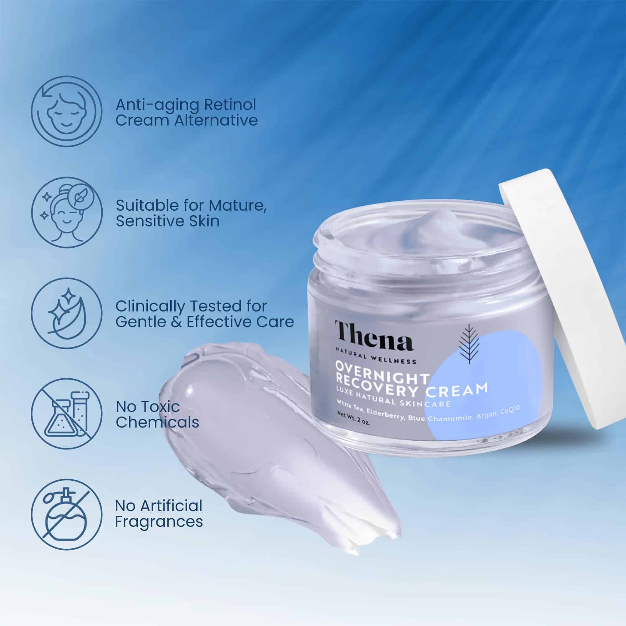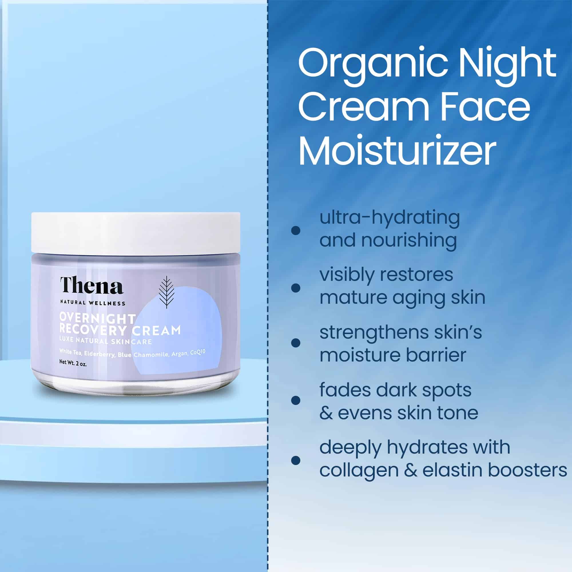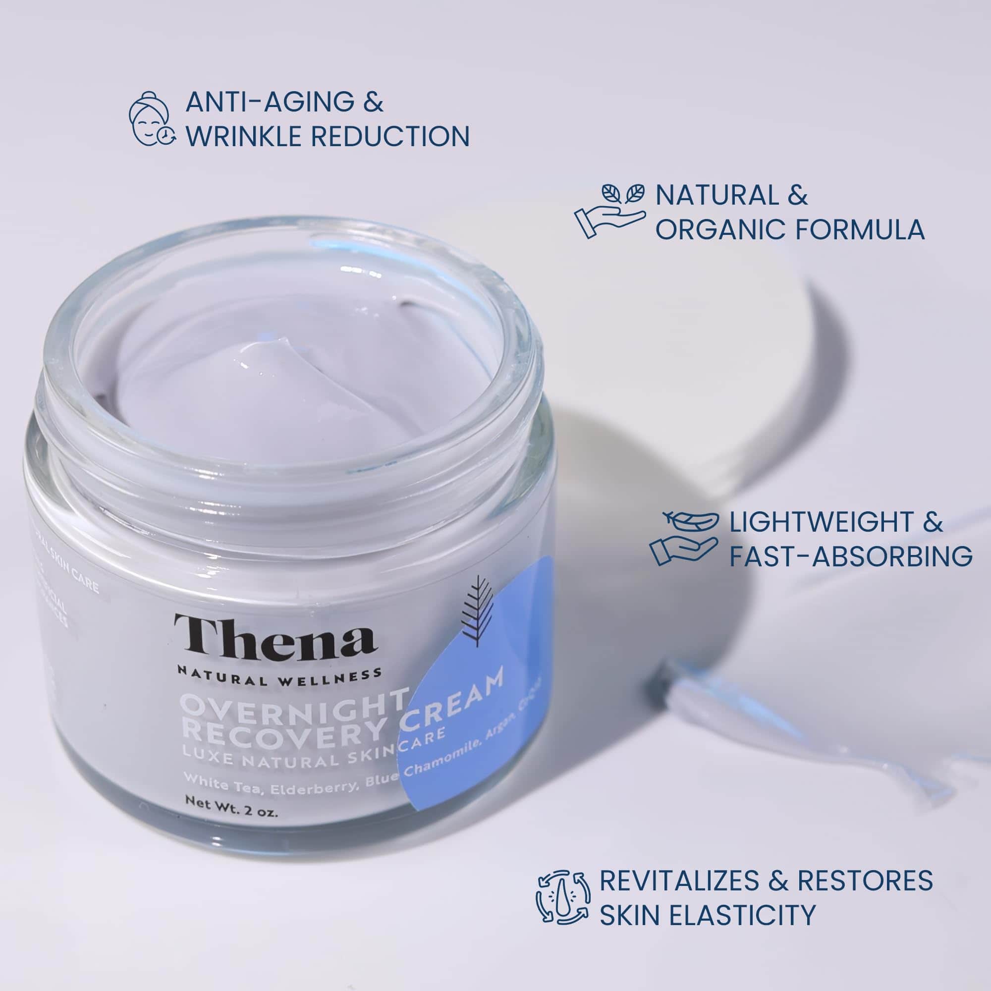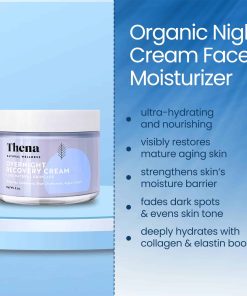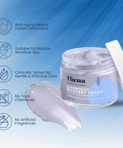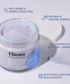 THENA Crema de Recuperación Nocturna es una crema anti envejecimiento natural y orgánica que te brinda una hidratación profunda y una nutrición intensiva mientras duermes. Su fórmula anti-envejecimiento nutre y suaviza los signos de envejecimiento, proporcionando todos los beneficios del Retinol sin la aspereza asociada. Además, revitaliza y reafirma la piel, mejorando su elasticidad y firmeza durante la noche para que despiertes con una piel hermosa, brillante y radiante. Esta crema está elaborada con los mejores ingredientes naturales y orgánicos como Ginseng, Manzanilla Azul y Neroli, sin fragancias ni colores artificiales, lo que la hace adecuada tanto para hombres como para mujeres. Su textura ligera y no grasa se absorbe rápidamente, dejando la piel lozana, suave y con un aspecto juvenil de forma natural. ¡Prueba THENA Crema de Recuperación Nocturna y despierta con una piel radiante todos los días!