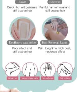 Solo 15-20 minutos, elimine fácilmente el vello púbico, permitiéndole lucir más bella y segura. a. Ácido hialurónico de bajo peso molecular: mantiene la hidratación de la piel b. Colágeno marino de algas rojas del norte de Francia: mantiene la elasticidad de la piel c. Extracto de hamamelis y hinojo marino: superreparación y mantenimiento de la ternura de la piel. 2. Después de la depilación, se recomienda encarecidamente utilizar un gel calmante especial. Debido a que la superficie de la piel es más frágil después de la depilación, es propensa a la opacidad si no se hidrata adecuadamente