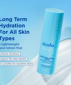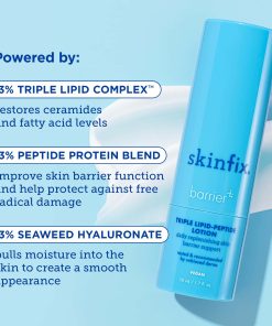 1. NO COMEDOGÉNICA Y LIGERA: Nuestra Loción Facial Triple Lipid-Péptido está diseñada para proporcionar una hidratación efectiva sin obstruir los poros. Ideal para piel normal a seca, incluso la más sensible, esta loción ayuda a rescatar y reparar la barrera de humedad de la piel. 2. MEZCLA SUPER HIDRATANTE DE ALGAS ROJAS DEL MAR: Formulada con un nivel activo de grasas buenas similares a la piel – aceites de escualeno, jojoba y macadamia – que imitan la estructura de los lípidos naturales vitales de la piel, para reponer esos lípidos de manera más efectiva. La mezcla súper hidratante de algas rojas está potenciada con hialuronato de sodio, que es un derivado de sal del ácido hialurónico, que retiene la humedad más fácilmente para una hidratación a largo plazo. 3. CÓMO UTILIZAR: Esta loción ligera se puede usar diariamente por la mañana y por la noche en la cara y el cuello. Aplique 1-2 bombas en la piel limpia y seca. Para aprovechar al máximo los beneficios de la barrera cutánea de grado clínico, combine esta loción con el Suero Activador Triple Lipid de Skinfix. 4. LA PIEL SALUDABLE COMIENZA CON UNA BARRERA SALUDABLE: La barrera de la piel es la primera línea de defensa de su cuerpo. Si se debilita, cosas dañinas (es decir, factores estresantes ambientales) ingresan en la piel y las cosas útiles (es decir, agua y lípidos naturales) se agotan. Esto conduce a signos prematuros de envejecimiento u otros problemas cutáneos como dermatitis, brotes y psoriasis. Arreglar la barrera cutánea es nuestra principal preocupación. Nuestras fórmulas están diseñadas para abordar problemas cutáneos mientras fortalecen la barrera de la piel. 5. LIMPIA, CLÍNICAMENTE PROBADA Y RECOMENDADA POR DERMATÓLOGOS: Sin fragancia añadida, libre de sulfatos, parabenos, skincare vegano y libre de crueldad probada y recomendada por dermatólogos imparciales.