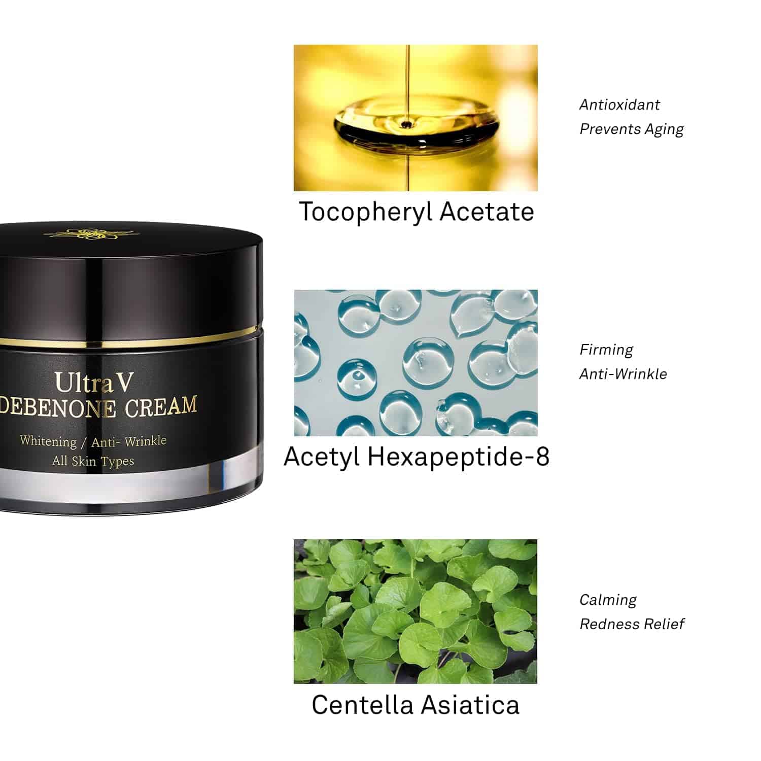 Crema facial Ultra V Idebenone: Antienvejecimiento e Hidratante Reafirmante con Péptidos, Adenosina, Niacinamida – Antioxidante para una Piel Radiante – 1.69 fl.oz. Nuestra crema facial UltraV IDEBENONE está enriquecida con potentes ingredientes antienvejecimiento de la nueva generación, denominados Idebenona. Esta crema antienvejecimiento facial ayuda a prevenir el envejecimiento natural y fotoenvejecimiento al suministrar a las capas más internas de la piel los nutrientes y la nutrición suficientes. La crema facial ultra hidratante UltraV contiene Acetato de Tocoferol para eliminar los radicales libres de la piel. Nuestra crema facial antienvejecimiento crea una barrera de hidratación en la piel para prevenir la pérdida de humedad y evitar que la piel se reseque, se vea opaca y escamosa, mientras mejora la textura de la piel. Esta crema facial antienvejecimiento con Adenosina ayuda a mejorar la elasticidad de la piel al tensar los poros y controlar la producción de sebo. Los ingredientes activos de nuestra crema facial ayudarán a mejorar la elasticidad y el volumen de la piel para brindarte una piel suave, texturizada y tonificada sin arrugas, líneas finas y signos prematuros de envejecimiento. Esta crema facial hidratante para piel seca con Cica ayuda a renovar las células de la piel y aporta vitalidad para proteger contra el enrojecimiento y la sensibilidad. La crema facial reafirmante UltraV con Niacinamida controla la formación de melanina para brindar una piel impecable con un cutis mejorado. Después de usar tóner o suero, toma una cantidad adecuada de la Crema UltraV IDEBENONE en la palma de la mano y aplícala suavemente en el rostro y el cuello. Da suaves palmaditas para su absorción en la piel. Puedes mezclar la crema facial IDEBENONE con el ampule IDEBENONE para lograr una rica hidratación.