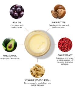 Crema hidratante facial y corporal 100% pura de bálsamo nutritivo de súper frutas, con una fórmula poderosa para la hidratación de pieles secas. Esta crema vegana de 1.06 oz aprovecha el intenso poder de las superfrutas para tratar y alimentar la piel súper seca. Contiene una combinación milagrosa de mantecas ricas y aceites de frutas para nutrir la piel seca o sensible con antioxidantes y una humedad profunda y decadente. Promueve una tez suave y juvenil con acai, mangostán y aceite de goji abundantes en vitamina C antienvejecimiento para estimular el colágeno y defender diariamente contra signos prematuros de envejecimiento causados por el daño de los radicales libres. Perfecta para sellar los nutrientes como último paso en tu rutina de cuidado de la piel, con aguacate, vitamina E y manteca de karité para suavizar, suavizar, tonificar, restaurar y proteger tu preciosa piel. Además, este producto es ideal para restaurar la piel apagada y desvanecida, diseñado para hidratar profundamente la piel más seca y se puede usar como una mascarilla de tratamiento general o para tratar puntos secos, escamosos y con picazón, reparando para hidratar y equilibrar la piel sedienta. Con una fórmula limpia y natural, esta crema hidratante no contiene químicos tóxicos, metales pesados, fragancias o colorantes. Es libre de crueldad, éticamente obtenida y sin gluten. Además, es un producto vegano y fabricado en EE. UU.