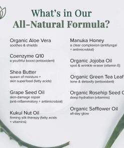 Crema hidratante natural para el rostro y cuerpo, elaborada con ingredientes 100% naturales y orgánicos. Esta crema ayuda a rejuvenecer la piel, calmar la irritación y la sequedad, así como promover el crecimiento celular natural. Con una mezcla de Aloe Vera, Manteca de Karité, Coenzima Q10, Aceite de Semilla de Uva, Miel de Manuka y Aceite de Nuez de Kukui. Ideal para calmar el eccema, reducir la picazón y las infecciones cutáneas, así como reparar y proteger la piel dañada. Proporciona una hidratación duradera y profunda sin obstruir los poros ni dejar sensación grasosa. Certificado como 100% natural, seguro y efectivo, sin fragancias artificiales, colorantes ni parabenos.