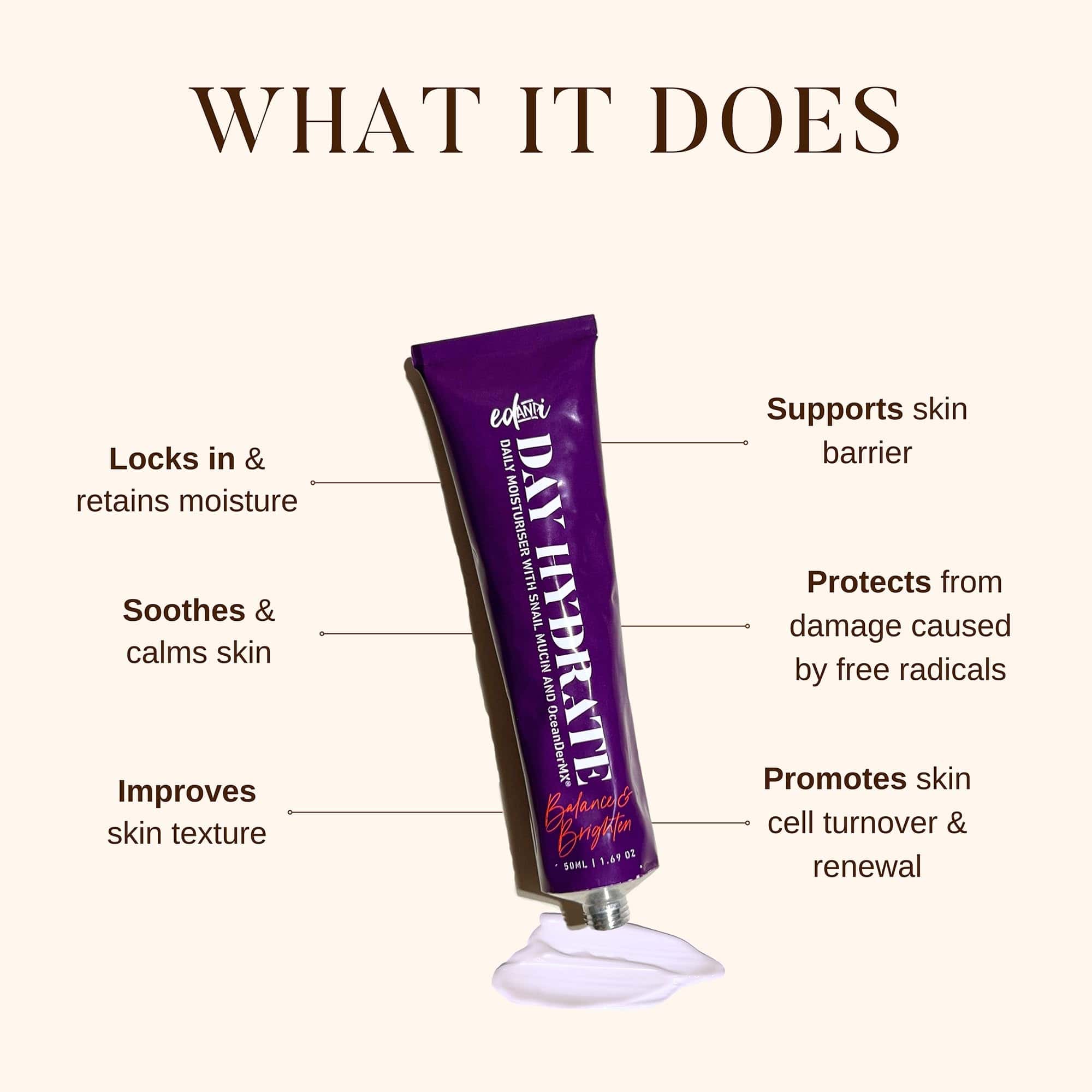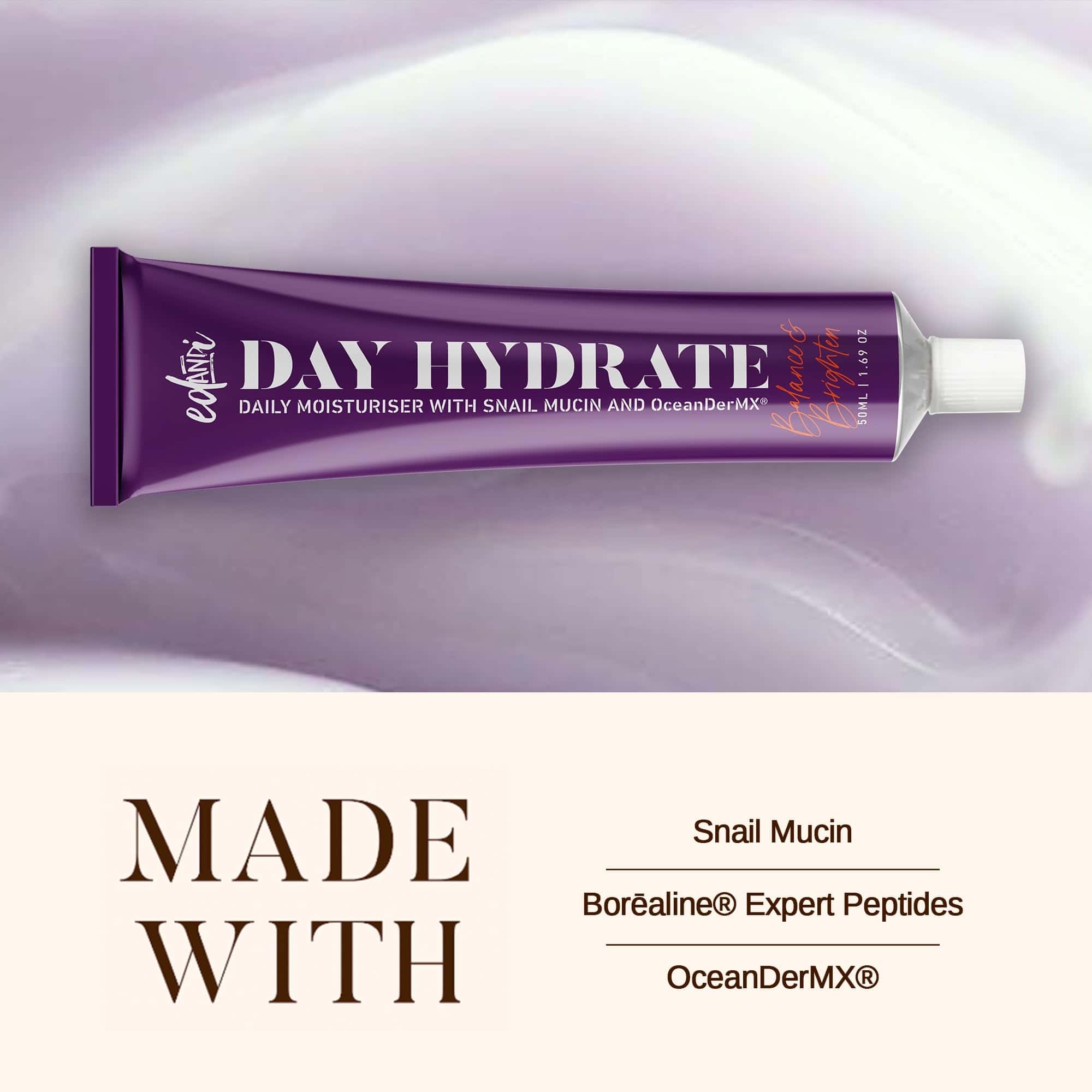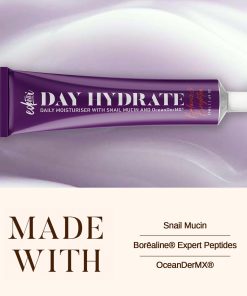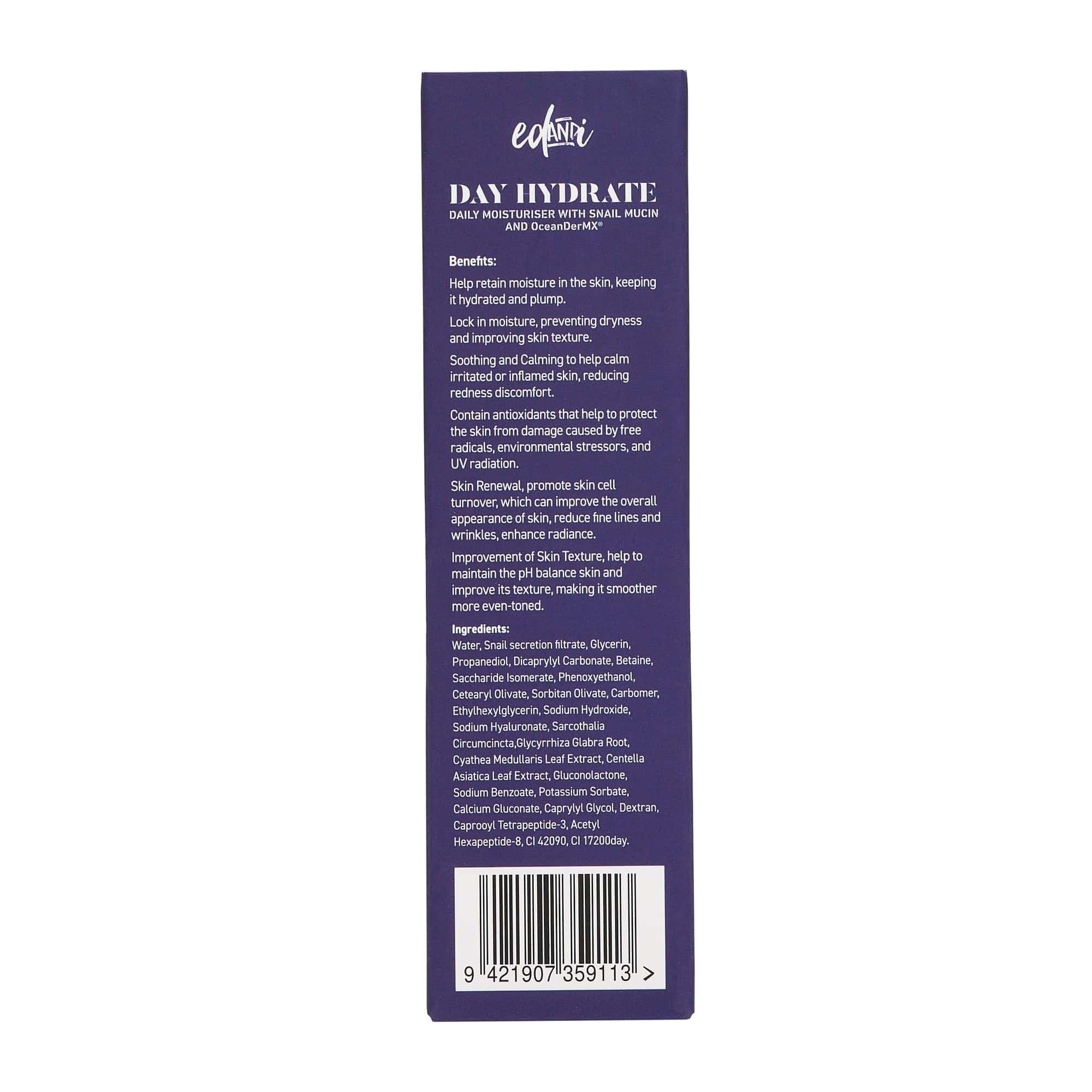 Crema hidratante diaria edandi DAY HYDRATE con Mucina de Caracol y OceanDerMX, diseñada para proporcionar una hidratación intensa, firmeza y reducción de las líneas finas. Esta crema está formulada para suavizar la apariencia de arrugas, apoyar la elasticidad de la piel y combatir el daño ambiental. La Mucina de Caracol real, un ingrediente único derivado de la secreción de caracol, revitaliza la piel al reducir la sequedad, el envejecimiento y la opacidad. Además, proporciona un alivio calmante para la piel deshidratada, todo sin dañar a los caracoles. Derivado de la naturaleza y mejorado con ciencia, este producto está hecho con verdadera Mucina de Caracol y Péptidos Expertos Borealine que ayudan a reducir la apariencia de líneas finas y aumentan la producción de colágeno. Los ingredientes limpios de primera calidad son seguros y están libres de fragancias, siliconas, alcohol, parabenos, sulfatos, PEG, colores sintéticos, filtros químicos UV, y además son cruelty free. Con la piel confiada como objetivo, la transparencia es la promesa de esta crema hidratante diaria, que se elabora en Nueva Zelanda con el poder de la naturaleza y la ciencia para ofrecer resultados excepcionales.