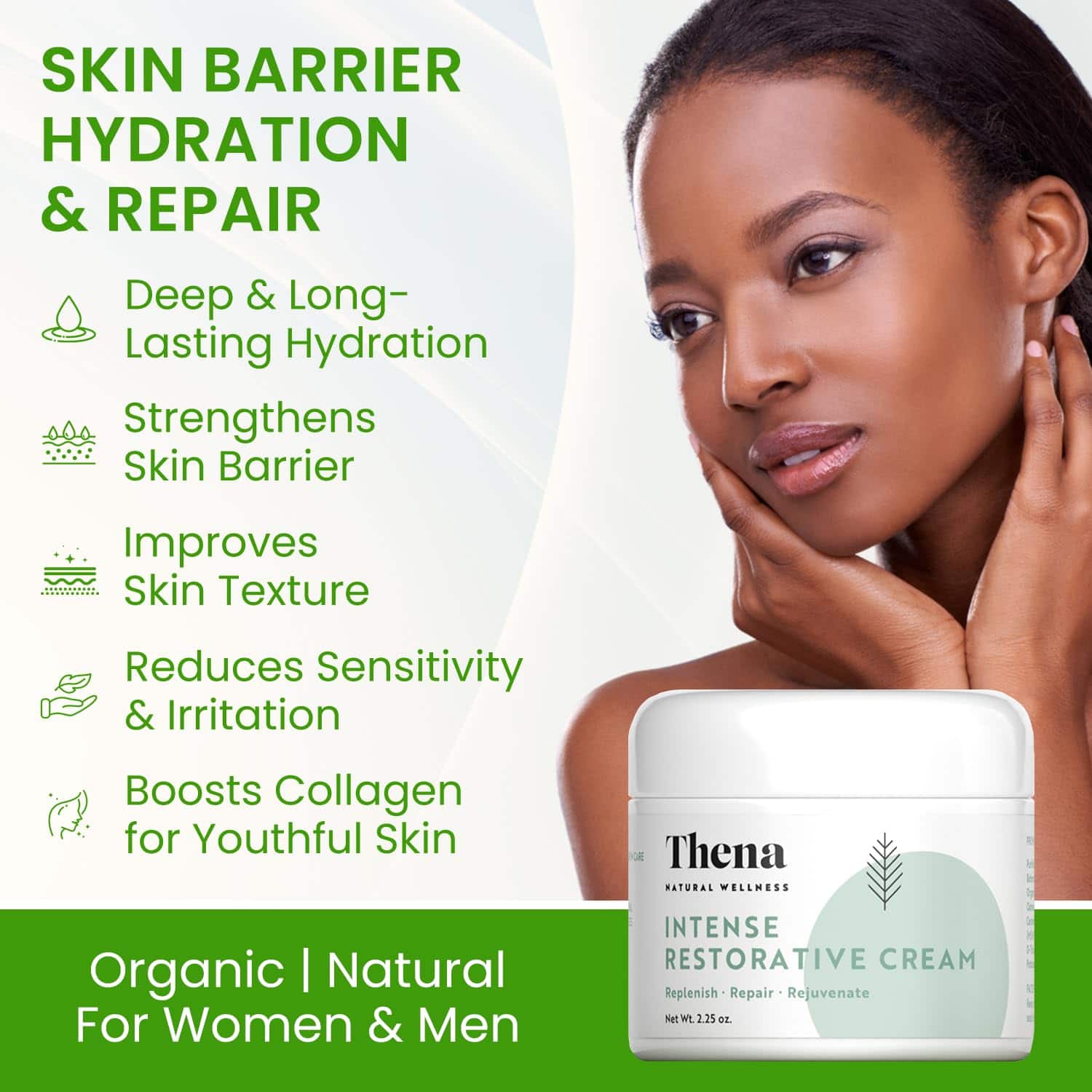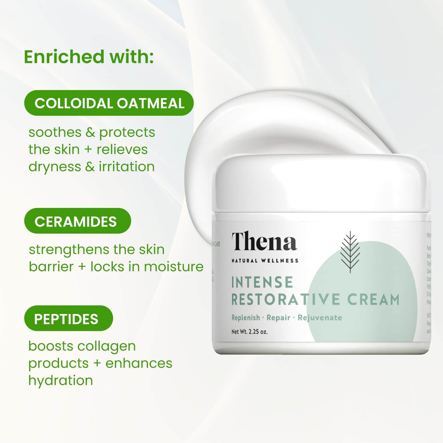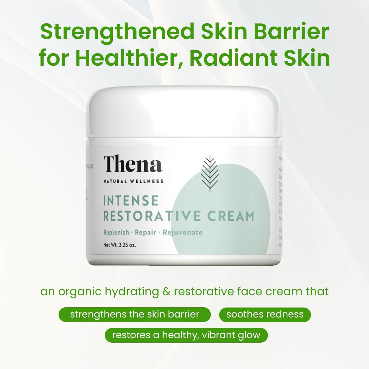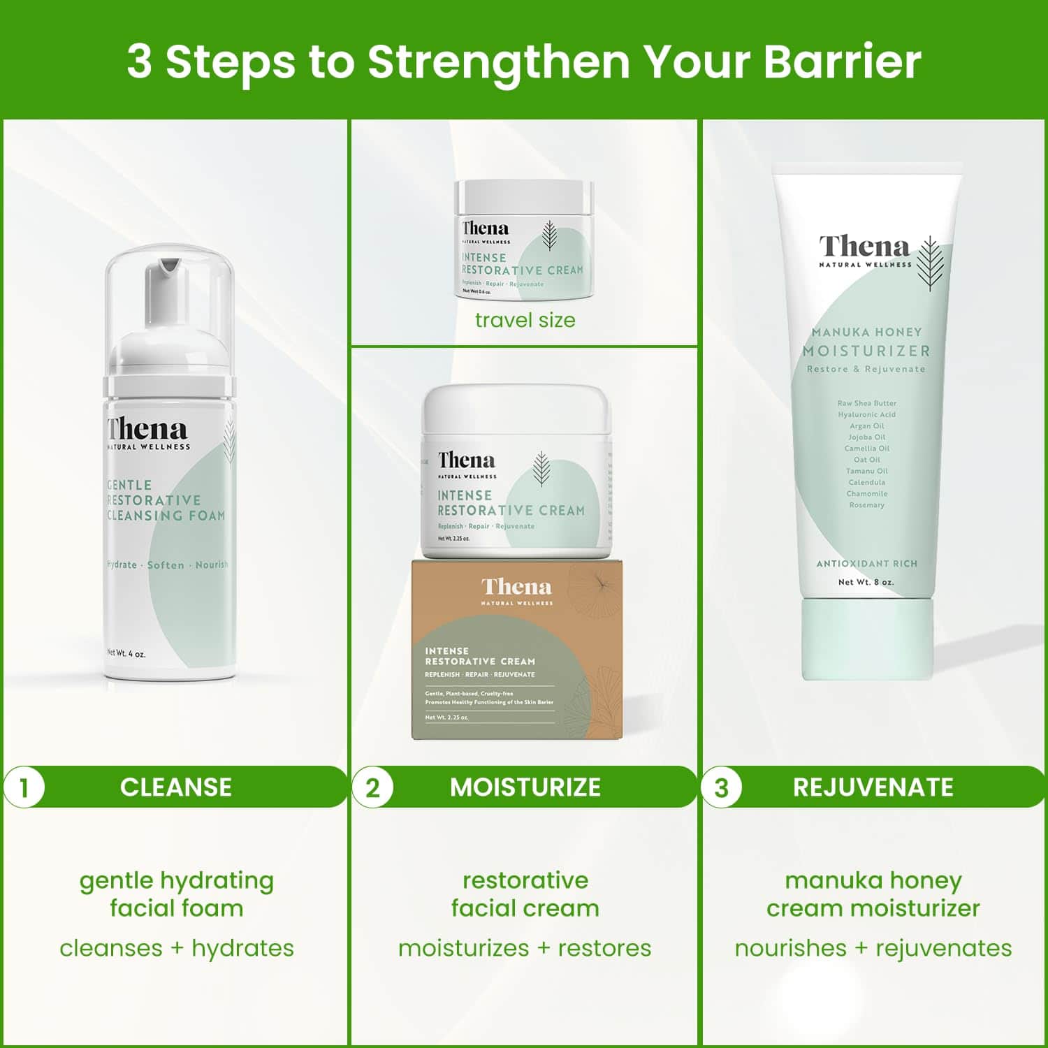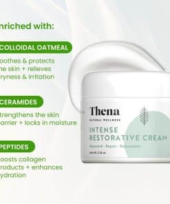 La Crema Hidratante Facial Para Piel Seca de Thena es el segundo paso en la Colección Esencial de Rutina Thena Restore. Diseñado para nutrir y fortalecer la barrera de la piel, esta crema facial rica y nutritiva es perfecta para personas con piel seca, sensible o propensa a la irritación.