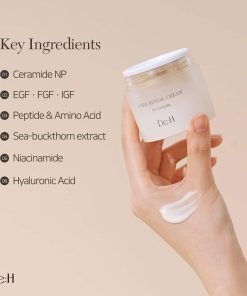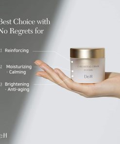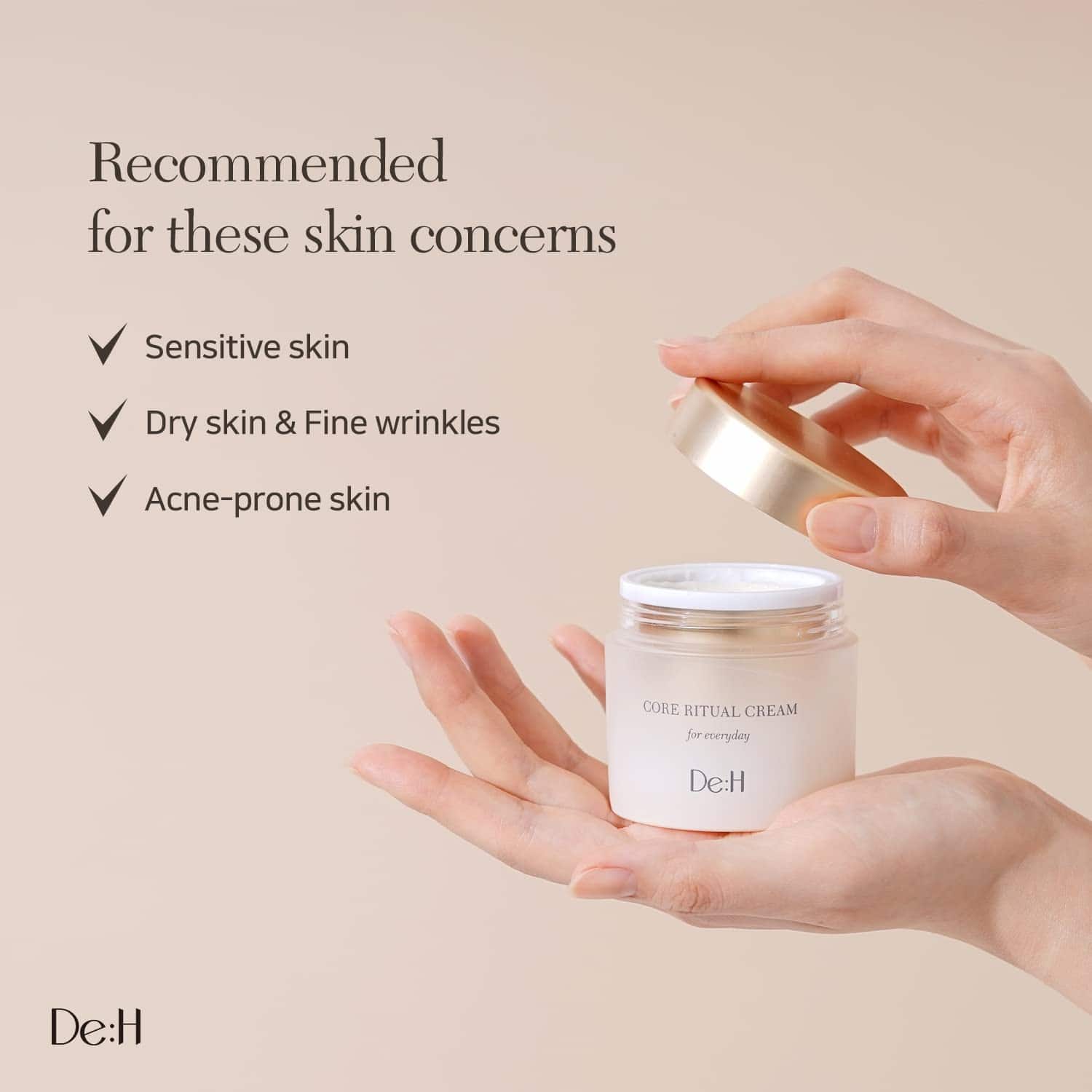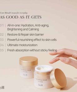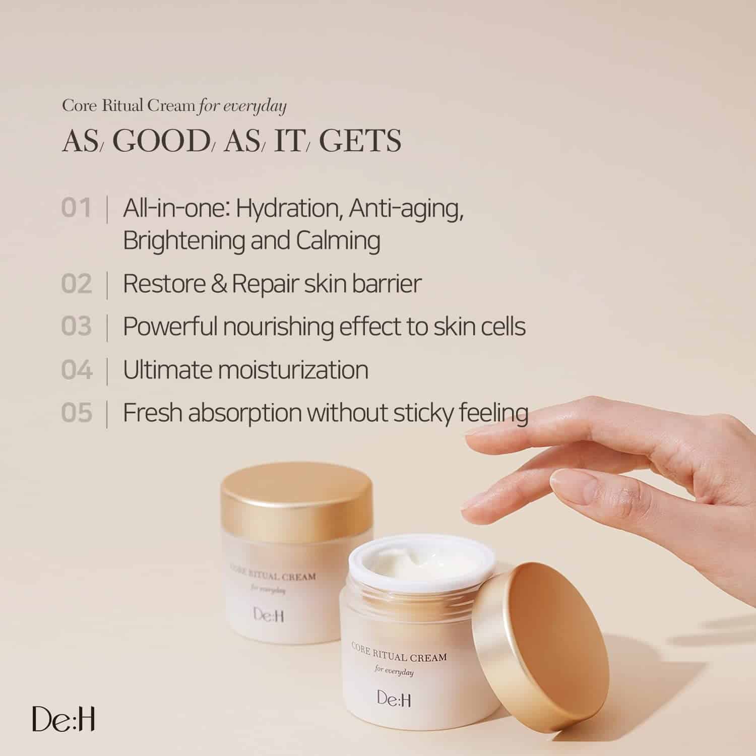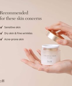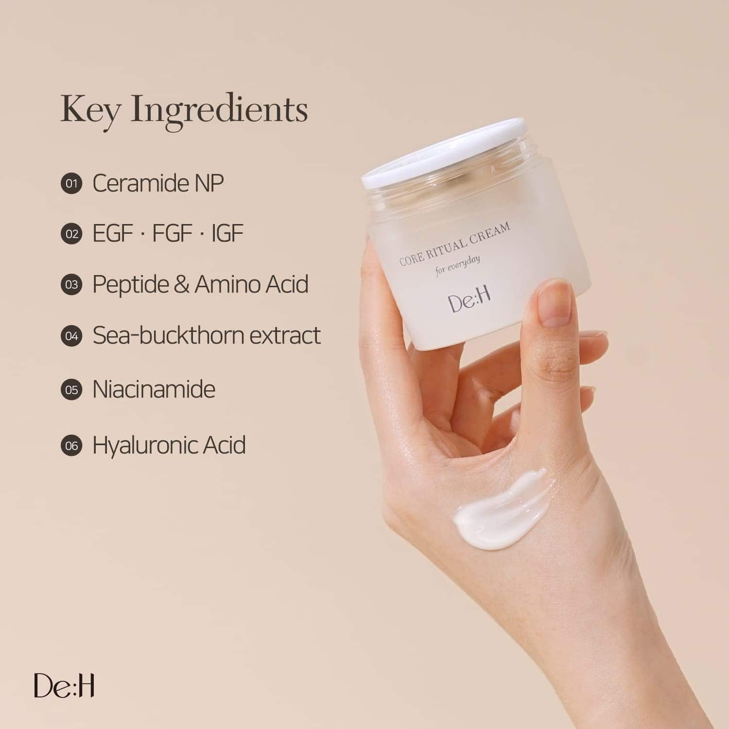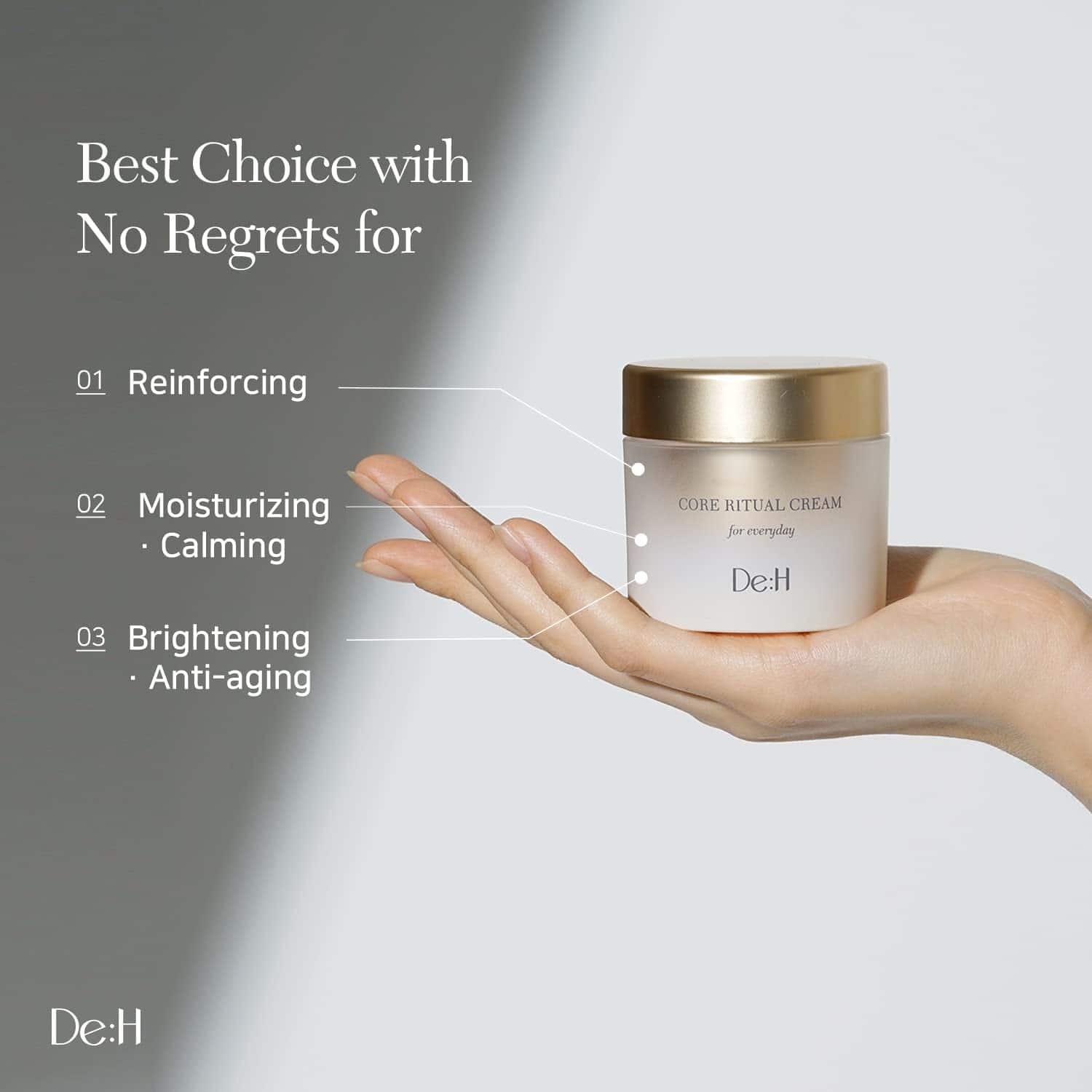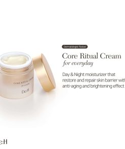 ¿Quieres disfrutar de la salud de tu piel y consentirte al mismo tiempo? El buen ambiente durante los rituales de cuidado de la piel es tan importante como los ingredientes y la función de los productos. La crema core ritual de De:H puede brindarte ambas cosas. Observa un buen producto, siente un agradable aroma a aceite natural y experimenta el notable efecto hidratante y anti-envejecimiento de larga duración. Restaura y repara la barrera de la piel con un factor hidratante natural, ceramida, ácidos grasos y ácido hialurónico de bajo peso molecular. Además, ingredientes clave como niacinamida, adenosina y extracto de espino amarillo tienen efectos anti-arrugas e iluminadores. Muchos clientes en Corea que lo han usado afirman que tiene tanto eficacia como seguridad. Esta crema es adecuada para pieles sensibles y secas. Desarrollada por dermatólogos, esta no es una crema barata, pero de alta calidad. Sentirás la diferencia de inmediato después de usarla. Una piel radiante e hidratada puede brindarte una apariencia más joven y saludable en lugar de la piel cansada y opaca. De:H skincare no realiza pruebas en animales y es libre de parabenos, sulfatos y ftalatos.