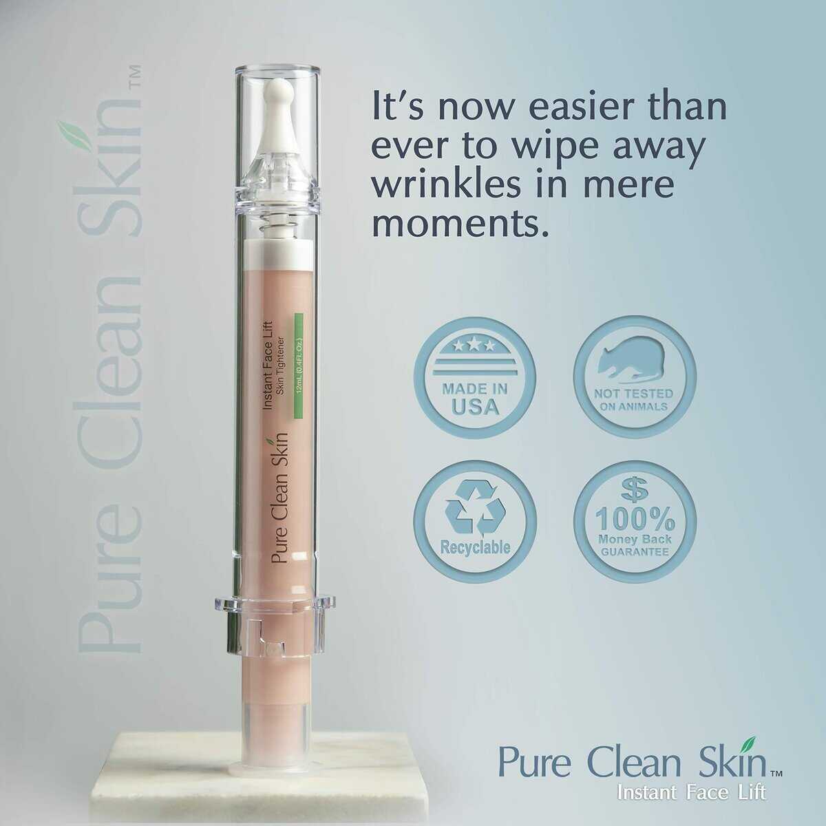 Desde el momento en que aplicas este producto Pure Clean Skin Instant Face Lift, experimentarás algo que nunca antes habías sentido. La crema tensora facial contiene una combinación notable de ingredientes activos naturales. Su composición biomolecular única aumenta la firmeza y la elasticidad al reducir los procesos destructivos que causan que el colágeno y la elastina de la piel envejecida se descompongan. Disfruta de este momento sabiendo que estás haciendo algo maravilloso por tu piel. En pruebas clínicas, el 100% de las personas probadas mostraron un levantamiento científicamente medible de inmediato, con una fuerza aún mayor después de solo 5 minutos. El efecto será aún más visible con un uso constante y continuo. Modo de uso – Agita bien. Aplica unas gotas en la piel limpia con las yemas de los dedos. Extiende hacia arriba y hacia afuera. Desliza suavemente sobre líneas finas y arrugas. Utiliza con moderación. Deja secar durante 5 minutos. Si aparece un film blanco, humedece con agua o una crema hidratante. Usa según sea necesario. Consulta los Videos Cortos para ver el uso del producto y ejemplos.