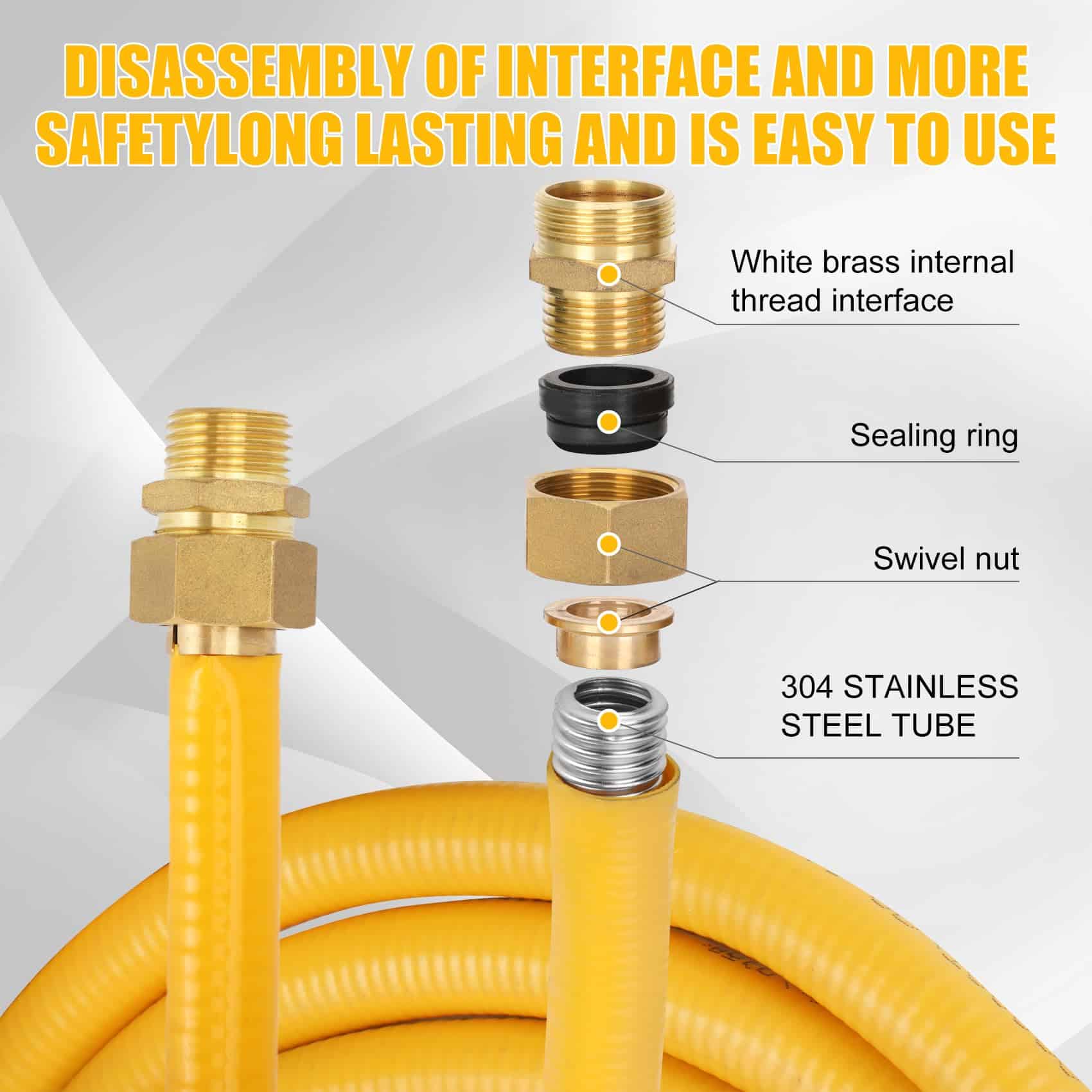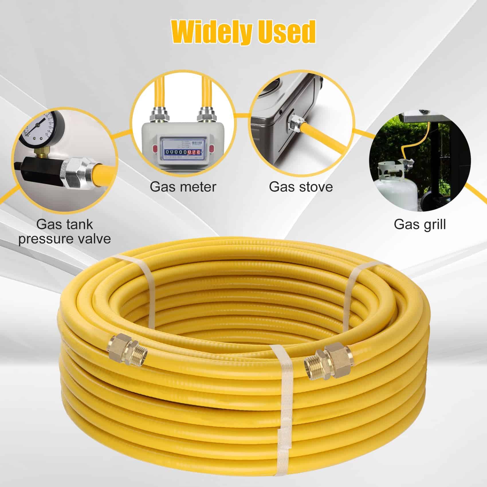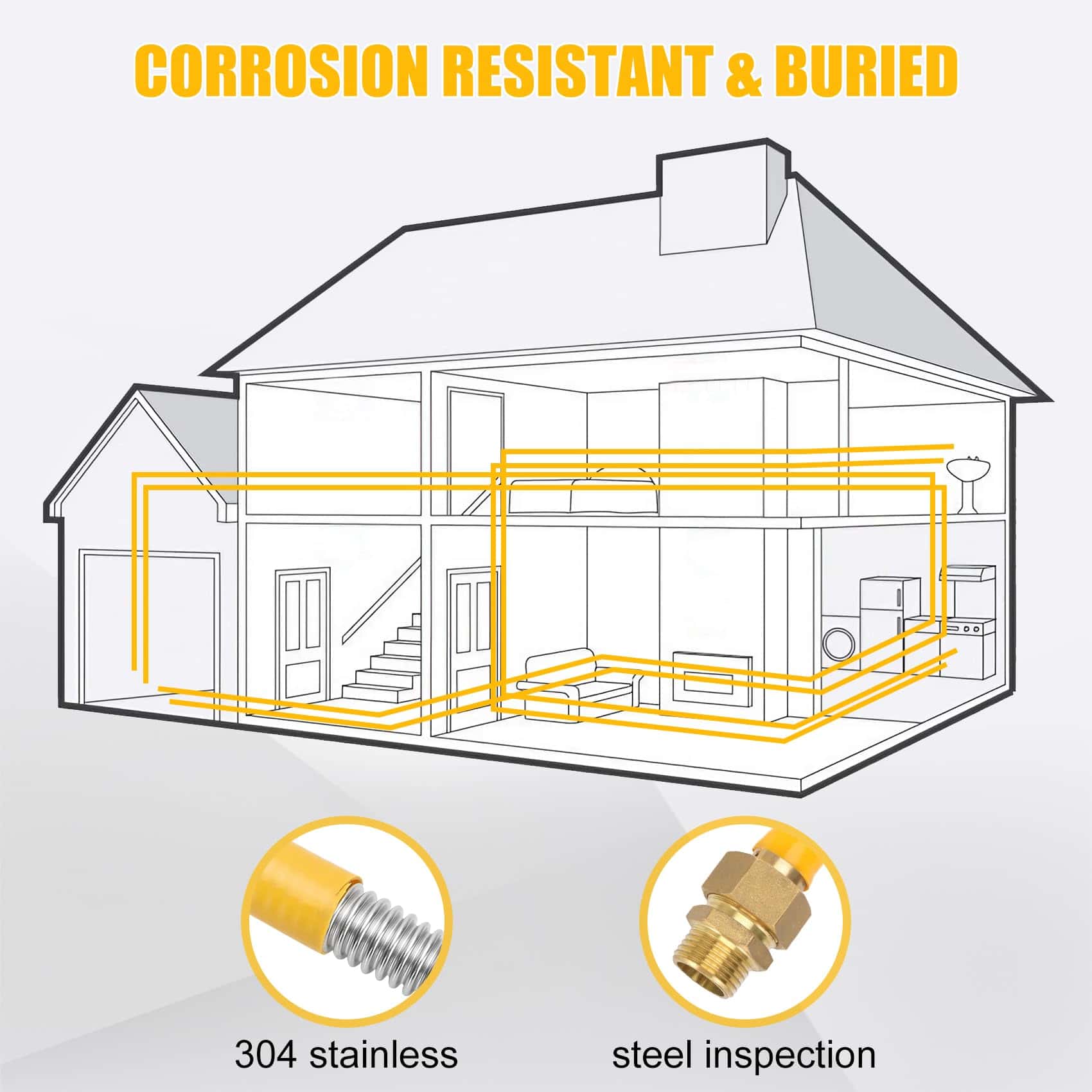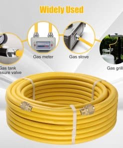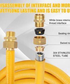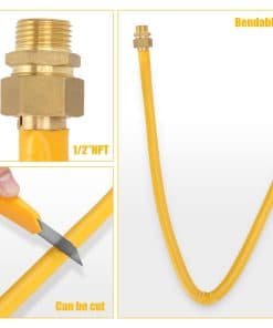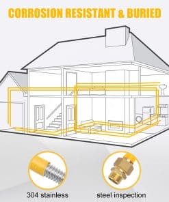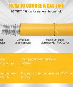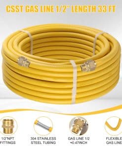 CSST 1/2″ Gas Line 33 pies Tubo de Acero Inoxidable Corrugado Línea de Gas Natural Kit de Conversión de Tubería de Propano para Parrilla con 2 Adaptadores Macho es un kit completo para la instalación de una línea de gas flexible en su hogar. Esta línea de gas de 33 pies de largo y 1/2″ de diámetro puede proporcionar una tasa de flujo de hasta 100,000 BTU/hora, lo que la hace ideal para parrillas u otros dispositivos que requieran una conexión de gas. La tubería está construida con acero inoxidable 304 en el interior para resistir la corrosión, y una chaqueta de polietileno amarillo en el exterior para protegerla de los elementos. Esta tubería es flexible y se puede cortar a la longitud que necesite, lo que facilita su instalación en diversas ubicaciones de su casa. Con un método de instalación seguro que incluye materiales de alta calidad y precauciones para evitar fugas de gas, puede estar seguro de que su suministro de gas estará protegido. Además, nuestro equipo de atención al cliente está disponible para responder a cualquier pregunta que pueda tener dentro de las 12 horas de recibirla. ¡Asegúrese de instalar nuestro kit correctamente y disfrute de un suministro de gas seguro y confiable en su hogar!