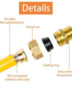 3. Material resistente – El interior de la línea de gas flexible es de acero inoxidable SUS304 resistente a la corrosión, la capa exterior es una chaqueta de polietileno amarilla resistente a los rayos UV de 0,079 pulgadas, Viene con accesorios de latón macho de 1/2″ en ambos extremos, roscas de tubería macho y hembra estándar para conexiones fáciles.