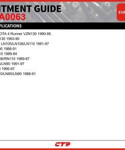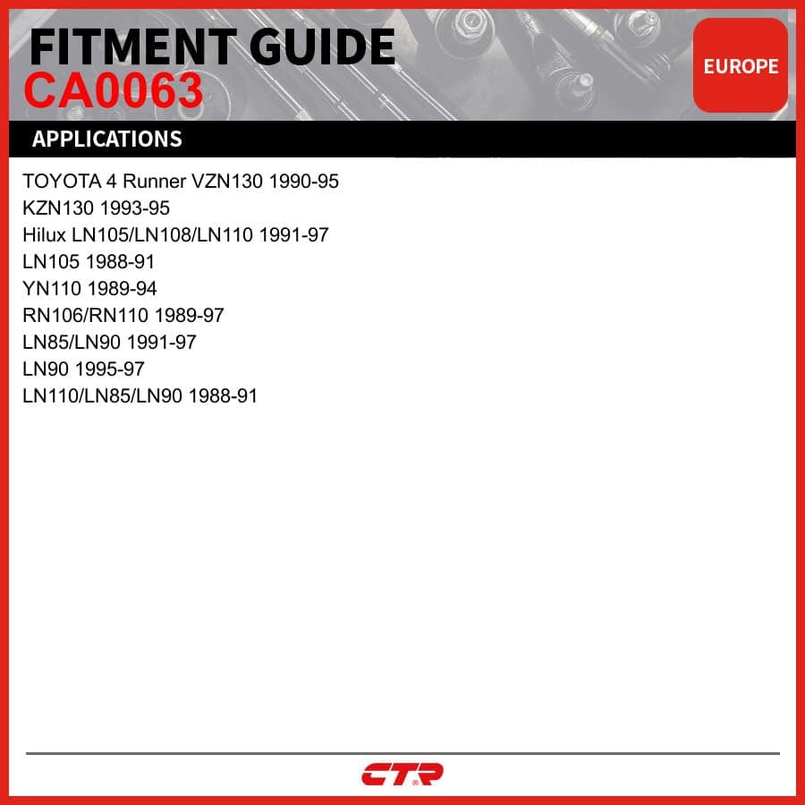 2. Para la Región Europea: Compatible con Toyota 4 Runner Vzn130 1990-95, Kzn130 1993-95; Hilux Ln105/Ln108/Ln110 1991-97, Ln105 1988-91, Yn110 1989-94, Rn106/Rn110 1989-97, Ln85/Ln90 1991-97, Ln90 1995-97, Ln110/Ln85/Ln90 1988-91.