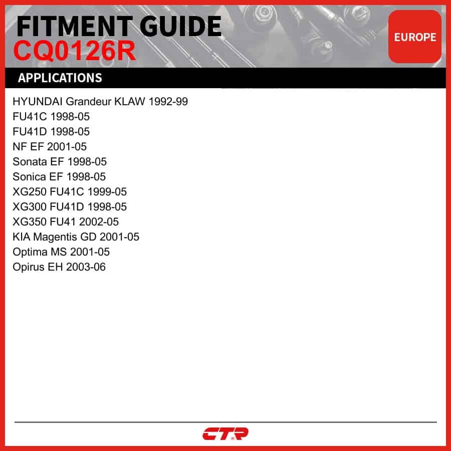 2. Compatible con Hyundai Grandeur Klaw 1992-99, Fu41C 1998-05, Fu41D 1998-05; Nf Ef 2001-05; Sonata Ef 1998-05; Sonica Ef 1998-05; Xg250 Fu41C 1999-05; Xg300 Fu41D 1998-05; Xg350 Fu41 2002-05; Kia Magentis Gd 2001-05; Optima Ms 2001-05; Opirus Eh 2003-06.