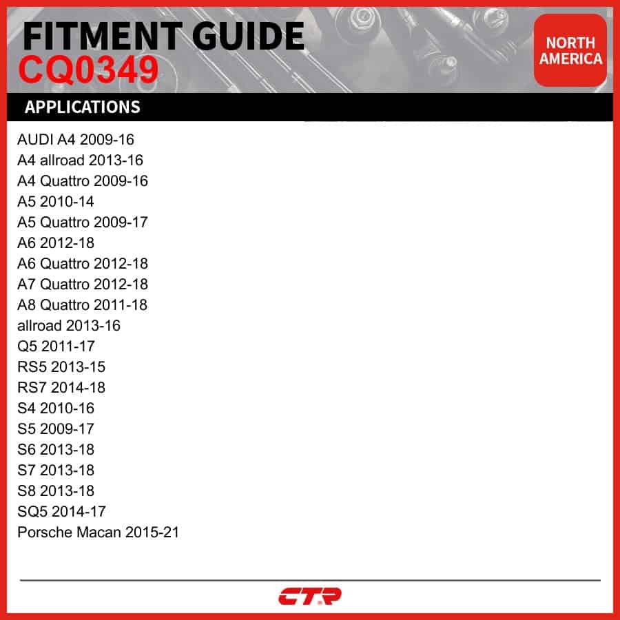 1. Para la región de EE. UU.: Compatible con Audi A4 2009-16, A4 Allroad 2013-16, A4 Quattro 2009-16, A5 2010-14, A5 Quattro 2009-17, A6 2012-18, A6 Quattro 2012-18, A7 Quattro 2012-18, A8 Quattro 2011-18, Allroad 2013-16, Q5 2011-17, Rs5 2013-15, Rs7 2014-18, S4 2010-16, S5 2009-17, S6 2013-18, S7 2013-18, S8 2013-18, Sq5 2014-17, Porsche Macan 2015-21. 2. Para la región de Europa: Compatible con Audi A4 8K5 2008-, 8K2 2007-; A4 Quattro 8K5 2008-, 8K2 2007-; A5 8T3 2007-; A5 Quattro 8T3 2007-; S5 Quattro 8T3 2007-; S4 Quattro 8K5 2009-, 8K2 2009-; Q5 Quattro 8Rb 2008-; A5 Cabrio 8F7 2009-; A5 Cabrio Quattro 8F7 2009-; S5 Cabrio Quattro 8F7 2009-; A4 Allroad Quattro 8Kh 2009-; A5 Sportback 8Ta 2009-; A5 Sportback Quattro 8Ta 2009-; S5 Sportback Quattro 8Ta 2010-; A8 Quattro 4H2/4H8 2009-, 4H2/4H8/4Hl 2010-, 4H8/4Hl 2011-, 4H2/4Hc/4Hl 2010-, 4H8 201. 3. Reemplaza 8K0501529L | ASEGÚRESE DE QUE ESTE NÚMERO DE PARTE SE AJUSTE A SU VEHÍCULO ANTES DE COMPRAR. 4. FABRICADO POR UN PROVEEDOR OE COREANO Productos de alta calidad para su módulo de suspensión, fabricados con orgullo por CTR, con materiales de primera calidad y estándares de precisión superiores para asegurar que sus necesidades sean satisfechas para su vehículo. CTR utiliza una base de bola de polímero especialmente diseñada, lo que resulta en un rendimiento duradero gracias al bajo daño por fricción y baja variación de torque. ADVERTENCIA: Este producto puede exponerlo a productos químicos como el negro de carbono, que según el Estado de California causa cáncer. 5. El brazo de control, también conocido a veces como brazo A, trapecio, brazo lateral, brazo de arrastre o brazo de enlace, dependiendo del vehículo, posición de la parte y función, ensambla la junta esférica y el casquillo en un cuerpo de alta resistencia. El casquillo de goma fija de manera segura el cuerpo del vehículo y el brazo de control absorbe los golpes que se producen durante el funcionamiento del vehículo.