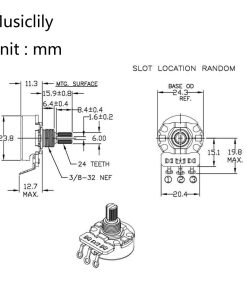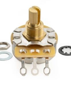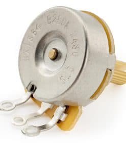 Los potenciometros CTS 450G B250K son ampliamente utilizados en controles de guitarra, se adaptan a la mayoría de las guitarras eléctricas y bajos de EE. UU. como ST, TL, PB, JB. Verdaderos potenciometros CTS 450G de la serie insignia de guitarras, especificaciones personalizadas por Musiclily. Eje dividido de 24 estrías fino de tamaño imperial para perillas de guitarra fabricadas en EE. UU., diámetro de eje dividido: 6 mm (15/64 de pulgada), diámetro de rosca: 9.5 mm (3/8 de pulgada), altura de rosca: 6.5 mm (1/4 de pulgada). Atenuación lineal, resistencia: 250K, tolerancia: 10%. Eje y casquillo de latón completo, respaldo con diseño vintage. Características de bajo ruido, construcción sólida, lubricante antiestático propietario, tacto suave, reducción de tambaleo del eje, cubierta soldable estañada. Por lo general, 250K se usa para pastillas de bobina simple, desvanece algunas de las altas frecuencias a tierra, brinda un tono más cálido que 500K. El paquete incluye: 4 potenciometros, arandelas de bloqueo, arandelas, tuercas.