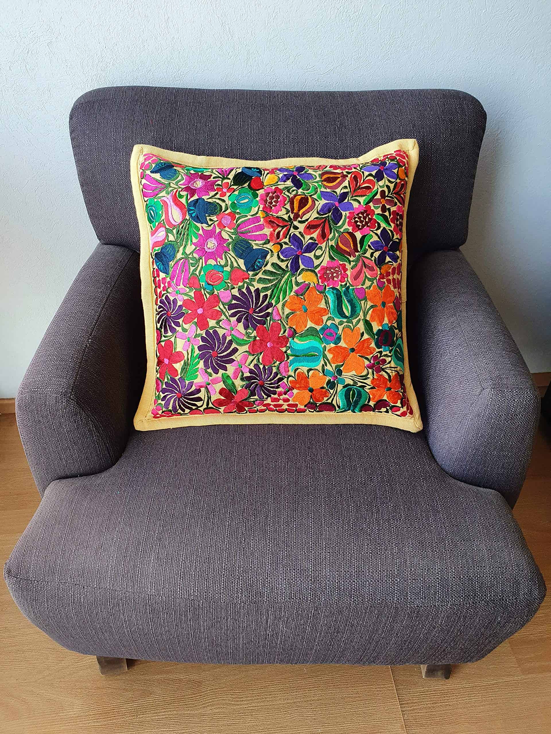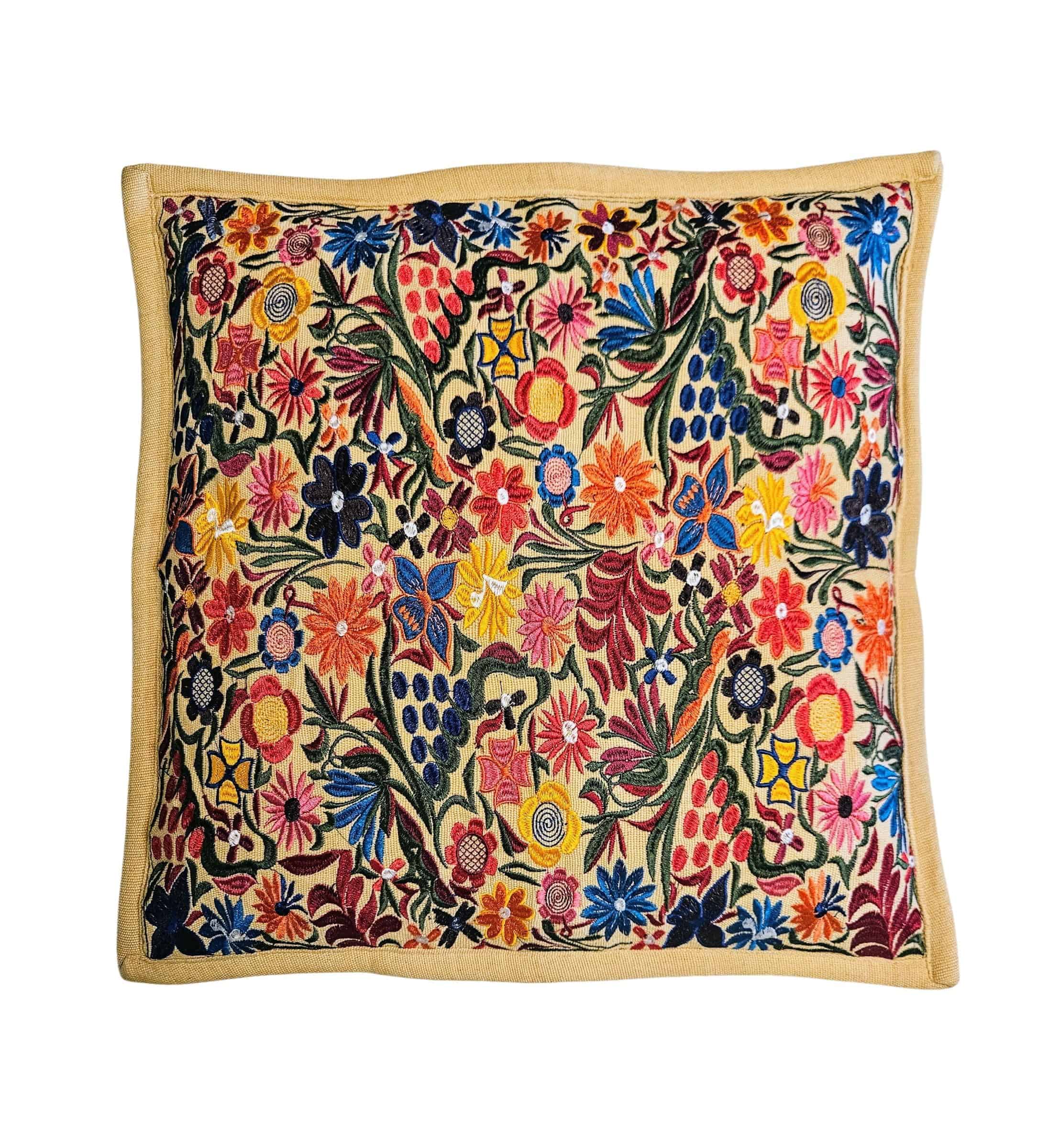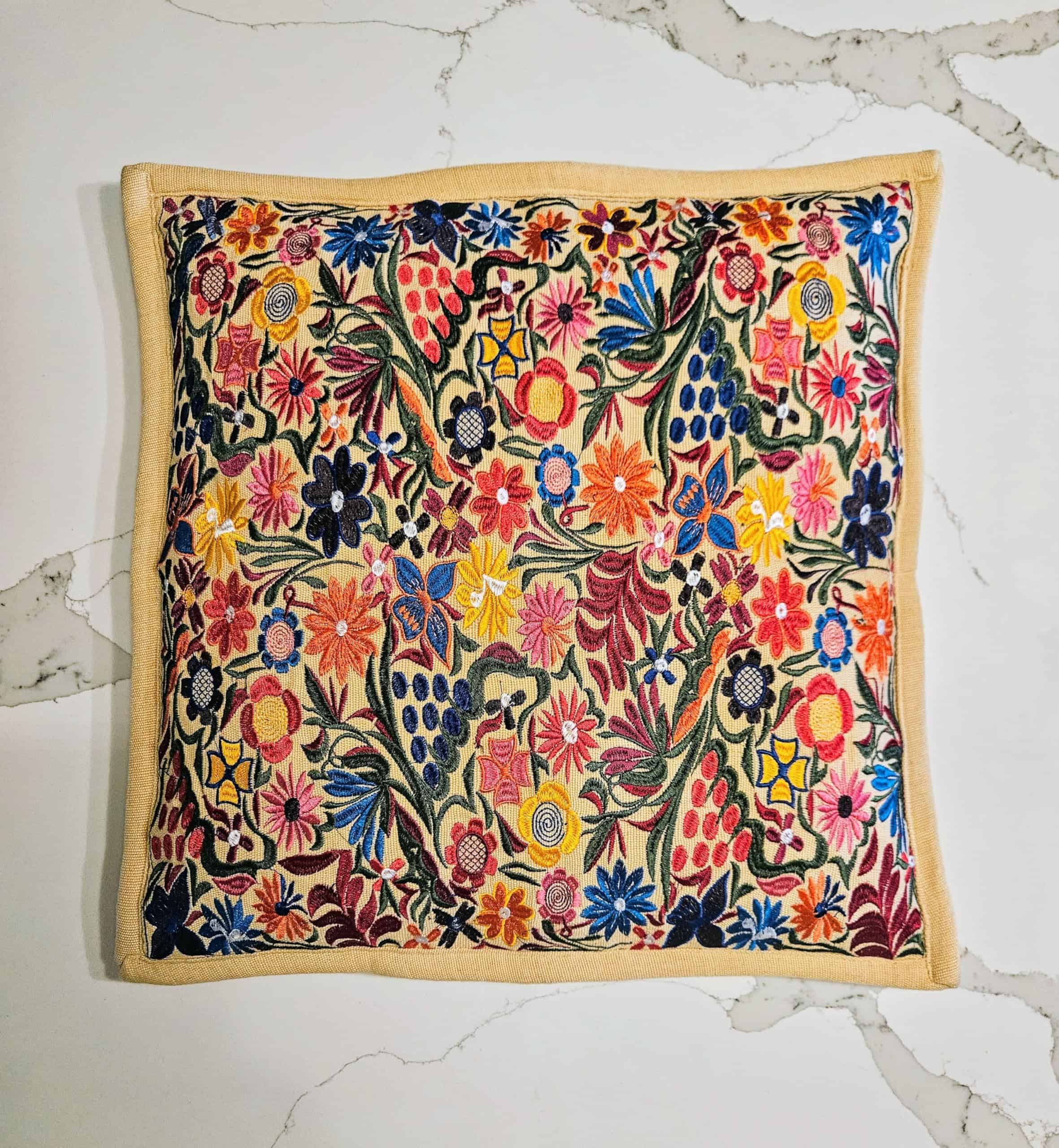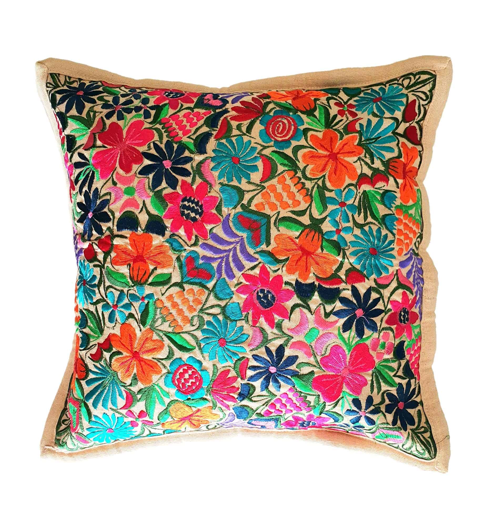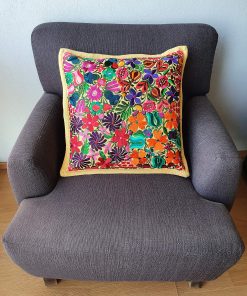Cubierta de almohada hecha a mano bordada con el famoso diseño colorido de flores de Chiapas. Estas coloridas cubiertas de almohadas florales agregarán color y se verán hermosas en tu sofá, cama, silla o en cualquier lugar, incluyendo tu pared. Cada cubierta de almohada es una creación única. El diseño floral y los colores pueden ser ligeramente diferentes a lo que se muestra en las imágenes. Bordado solo en el frente. Cierre con cremallera oculta en la parte trasera. Inserto de almohada no incluido. Tamaño: 19 x 19 pulgadas / 49 x 49 cm.