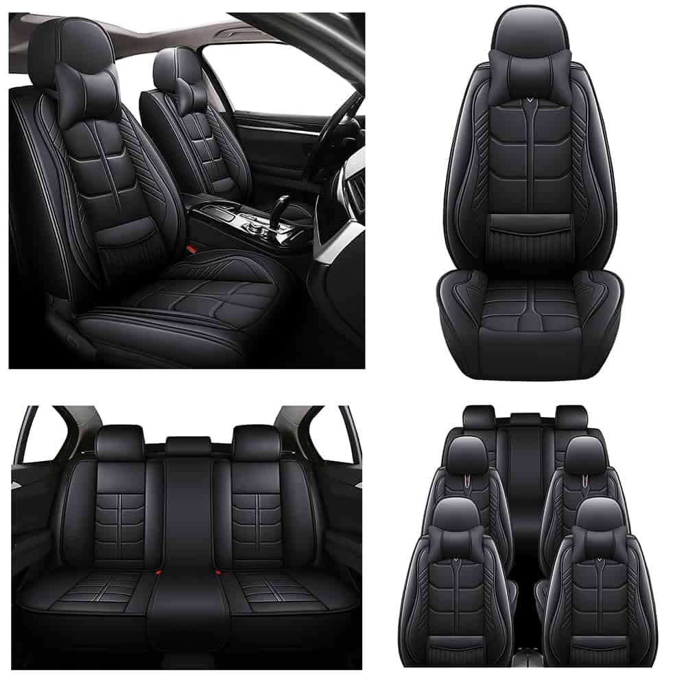 4. Funcionalidad y seguridad: Nuestras cubiertas de asiento para carro están diseñadas para adaptarse perfectamente a los contornos de tu carro. El soporte lumbar fijo brinda excelente soporte para tu espalda baja, mientras que el material elástico en los lados permite que las cubiertas del asiento delantero se adapten a la forma del asiento, cubriendo toda el área del asiento y reposacabezas sin deslizarse. Las cubiertas de asiento también están diseñadas para adaptarse a los airbags y cinturones de seguridad sin interferir con su despliegue, garantizando la seguridad óptima.