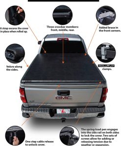 Cubierta de cama de tonel suave ROLLITUP para camionetas Chevy Colorado/GMC Canyon con cama de 5’2». Nuestra cubierta se ajusta perfectamente a los rieles de su cama y está diseñada específicamente para su modelo de camioneta. El mecanismo de cierre es fácil de usar y se bloquea en el extremo de la compuerta trasera, manteniendo la cubierta apretada y sin arrugas gracias a su sistema de tensión ajustable. La cubierta está hecha de vinilo marino resistente a las roturas de 24 onzas y cuenta con 3 barras transversales para soporte adicional cuando está plana. Los rieles laterales y abrazaderas están fabricados en aluminio 6063, que es resistente a la corrosión. Cuando desee acceder a su cama, el ROLLITUP le permite acceso completo sin tener que quitar la cubierta, gracias a su diseño con tira de gancho y lazo en los lados y mecanismo de liberación de cable. La instalación es rápida y fácil, sin necesidad de perforaciones, ya que incluye todas las herramientas e instrucciones necesarias. Asegúrese de verificar la compatibilidad con la aplicación antes de realizar la compra.