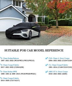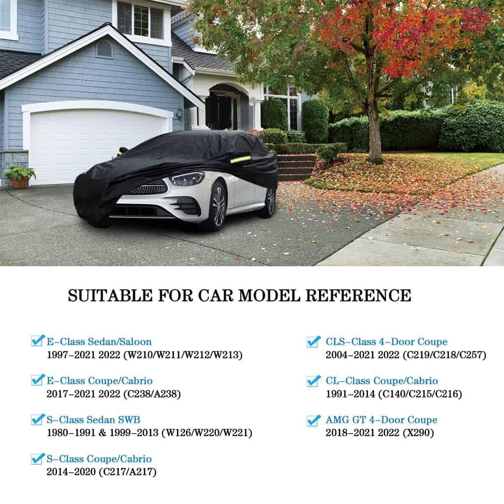 Cubierta de coche Abdeck compatible con Mercedes Benz Clase E 1997-2025 Sedán, Coupé, Cabrio E300 E320 E350 E400 E450 E550 E43 E53 E63 E63S AMG. Esta cubierta de coche para exteriores es específicamente diseñada para modelos selectos de Mercedes Benz, incluyendo la Clase E, Clase S, Clase CL, Clase CLS, y AMG GT. Está hecha de poliéster Oxford transpirable y resistente a las rasgaduras en el exterior, con una capa de revestimiento plateada y una capa impermeable en el interior para una protección completa contra factores externos. La cubierta cuenta con 6 tiras reflectantes fluorescentes para mayor visibilidad durante la noche, 4 correas a prueba de viento para mantenerla en su lugar, y dobladillos elásticos ajustables para un ajuste ceñido. Además, tiene 2 bolsillos para los espejos para una cobertura óptima. Protege tu coche de la lluvia, rayos UV, nieve, polvo, excrementos de aves, y huellas de gato. Esta cubierta de coche es perfecta para uso tanto en interiores como en exteriores, y viene con una bolsa de almacenamiento para mayor conveniencia.