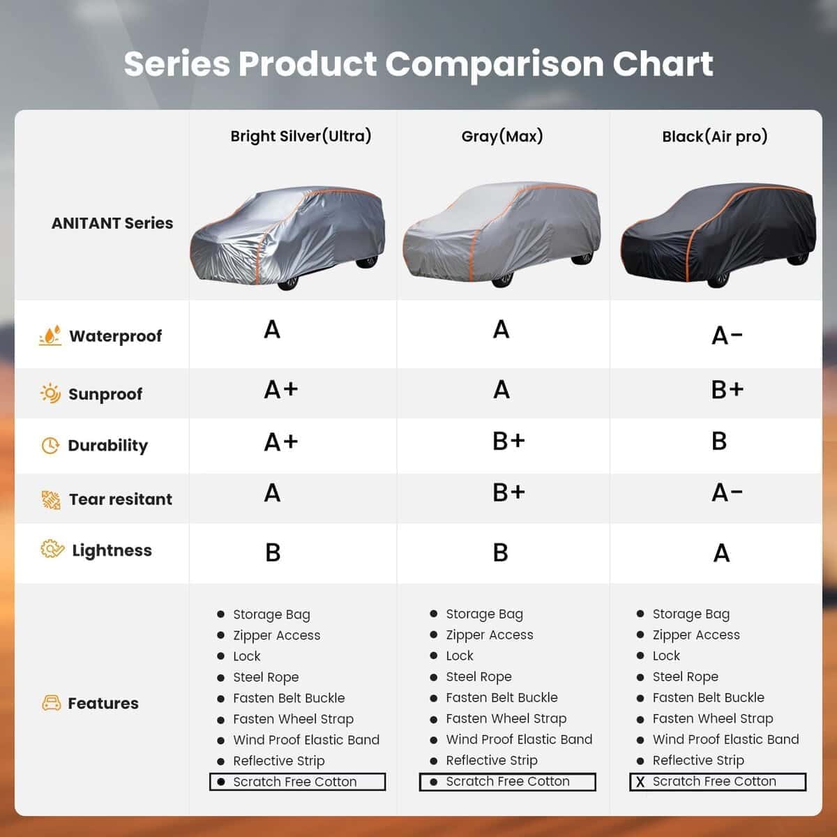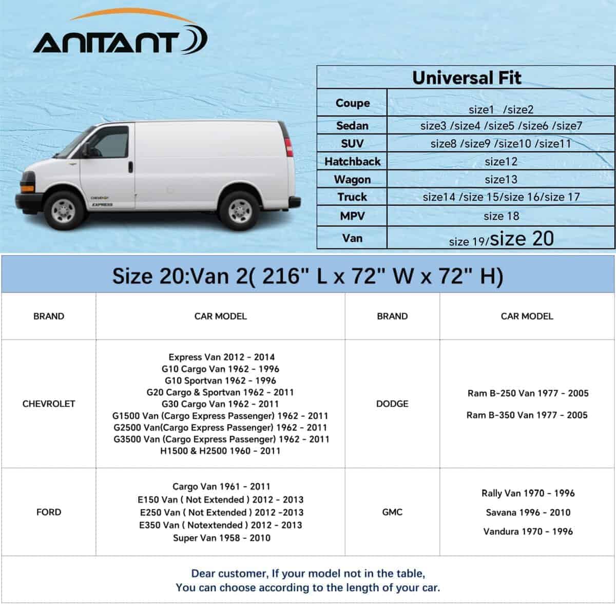 Cubierta de coche ANITANT ligera para mini van con cubierta premium para parabrisas con bordes magnéticos. Incluye banda elástica a prueba de viento en la parte delantera y trasera, hebilla para pasar por debajo del coche a modo de fijación, diseño de cremallera en el lado del conductor para facilitar la entrada, cuerda de acero y cerradura para evitar pérdidas, tira reflectante, 4 tiras para asegurar la cubierta a las ruedas y bolsa de almacenamiento. Apta para todas las mini van de hasta 228″ L x 72″ W x 72″ H. Protección para todas las condiciones climáticas: resistente al agua, protege contra los rayos UV, la lluvia, la nieve, el polvo, el granizo y las deposiciones de pájaros. Garantía de 12 meses.